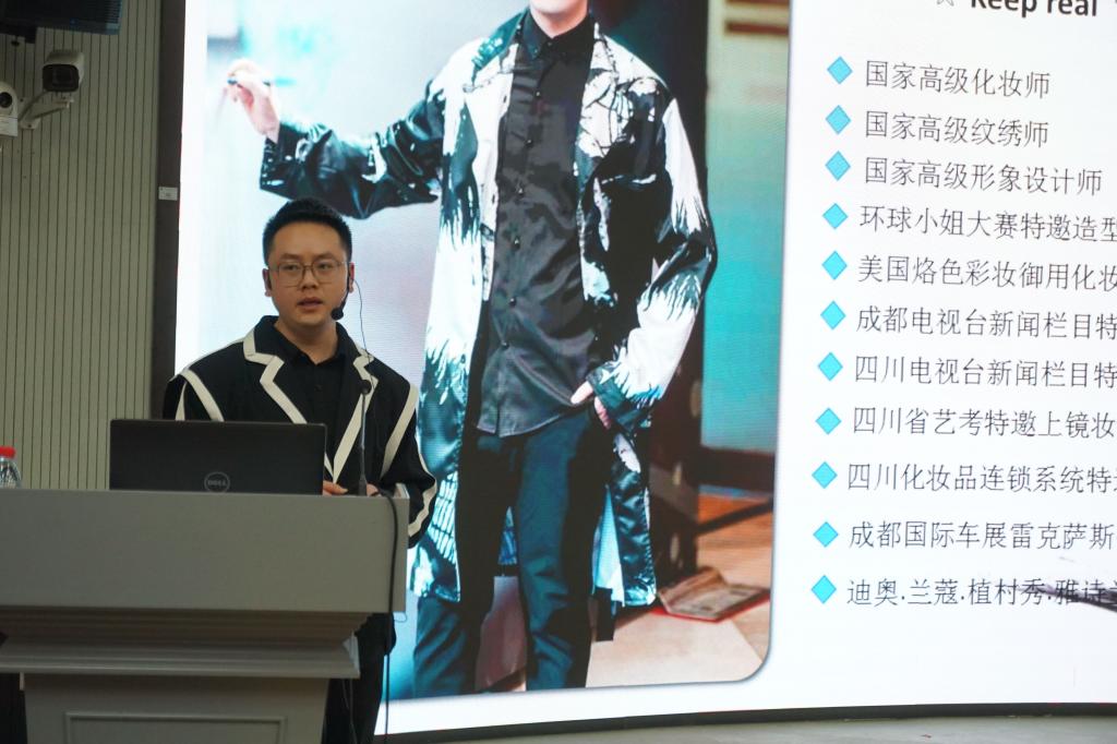 接下来同学们饶有兴趣的进入教室等待职业妆技巧讲座。首席化妆师李春辉老师以风趣大方的姿态亮相,讲述实用化妆技巧,金句频出,干货满满。李老师从肤质讲起,讲座内容涵盖护肤、底妆、彩妆、卸妆等各个方面,起到良好的科普作用。