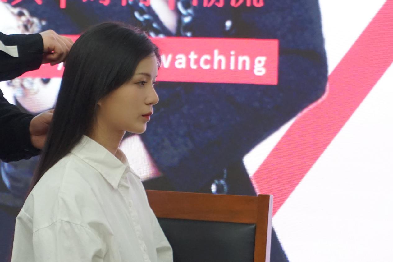 科普告一段落,李老师邀请模特上台对妆容造型进行现场示范教学,最后,一个能给职场面试加分的妆容展现在众人眼前。
