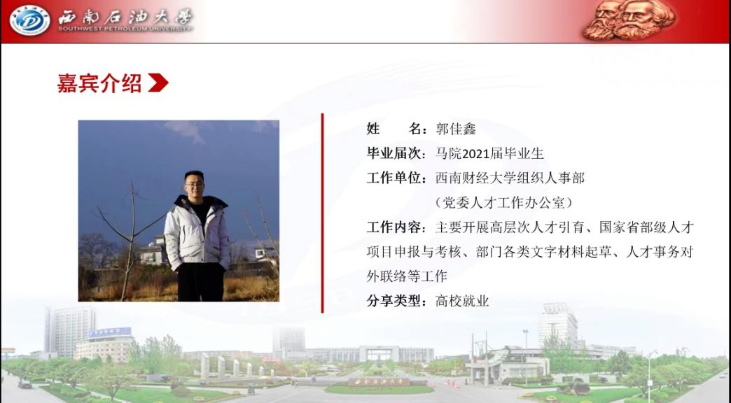 就职于四川水利职业技术学院的刘丁蓓师姐强调,我们应该找准目标,认清自身定位和能力,发挥特长备战就业。她谈到,笔试能力强的同学可以多去参加考试,积累自身经验;面试能力强的同学可以多参与人才引进招聘会,多去参与面试。同时,作为马克思主义理论的学生,也应关注重点时政问题,多学多思,以在面试中充分展现个人能力、发挥优势特长。