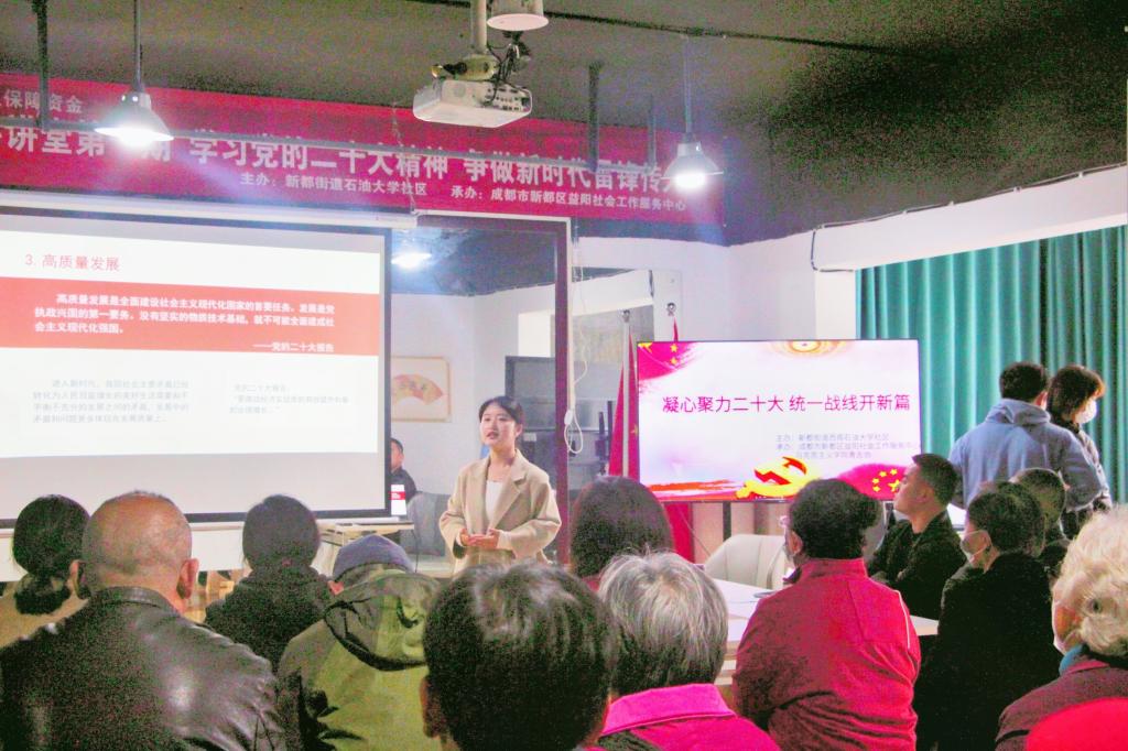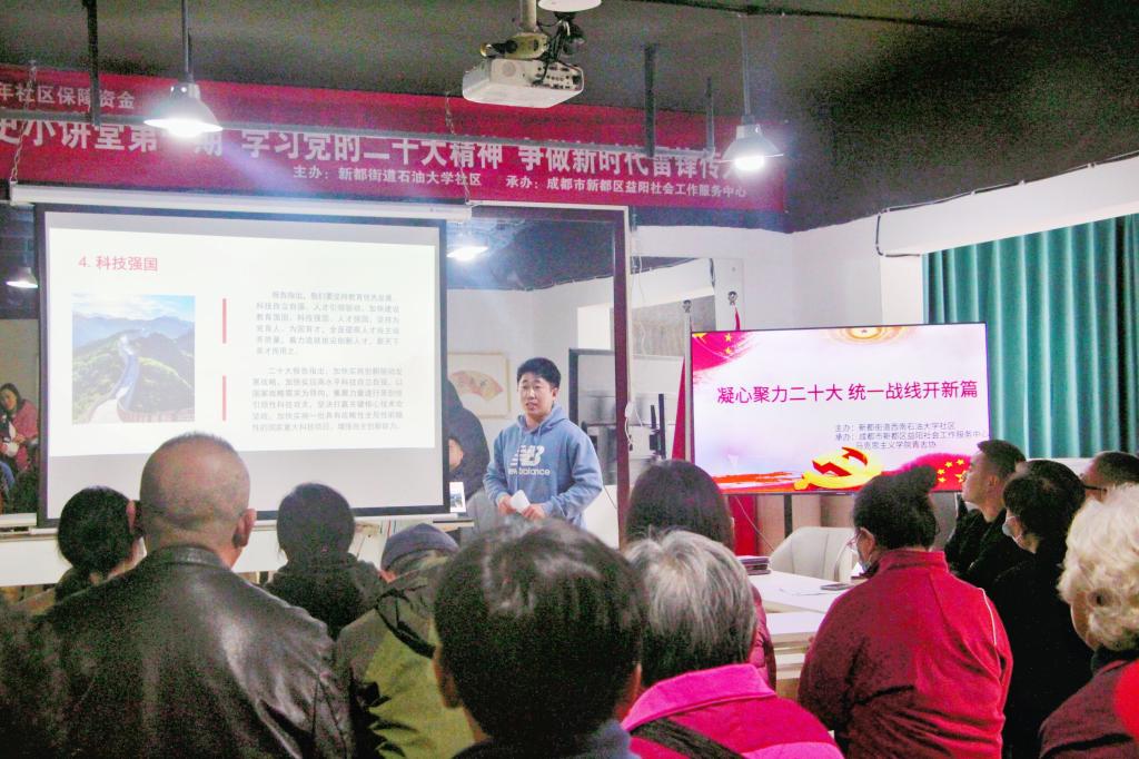 为了深入宣传贯彻好党的二十大精神,用好宣传阵地,打通理论进基层“最后一公里”,让广大人民群众全面、准确、及时地学习掌握党的二十大精神。3月23日下午,西南石油大学马克思主义学院思源宣讲团在西南石油大学社区开展了学习贯彻党的二十大精神宣讲活动。本次宣讲活动由马院2022级研究生李芷萱主持,宣讲团成员邓心一、都明亮主讲,社区工作人员、社区居民近30余人参加此次宣讲。