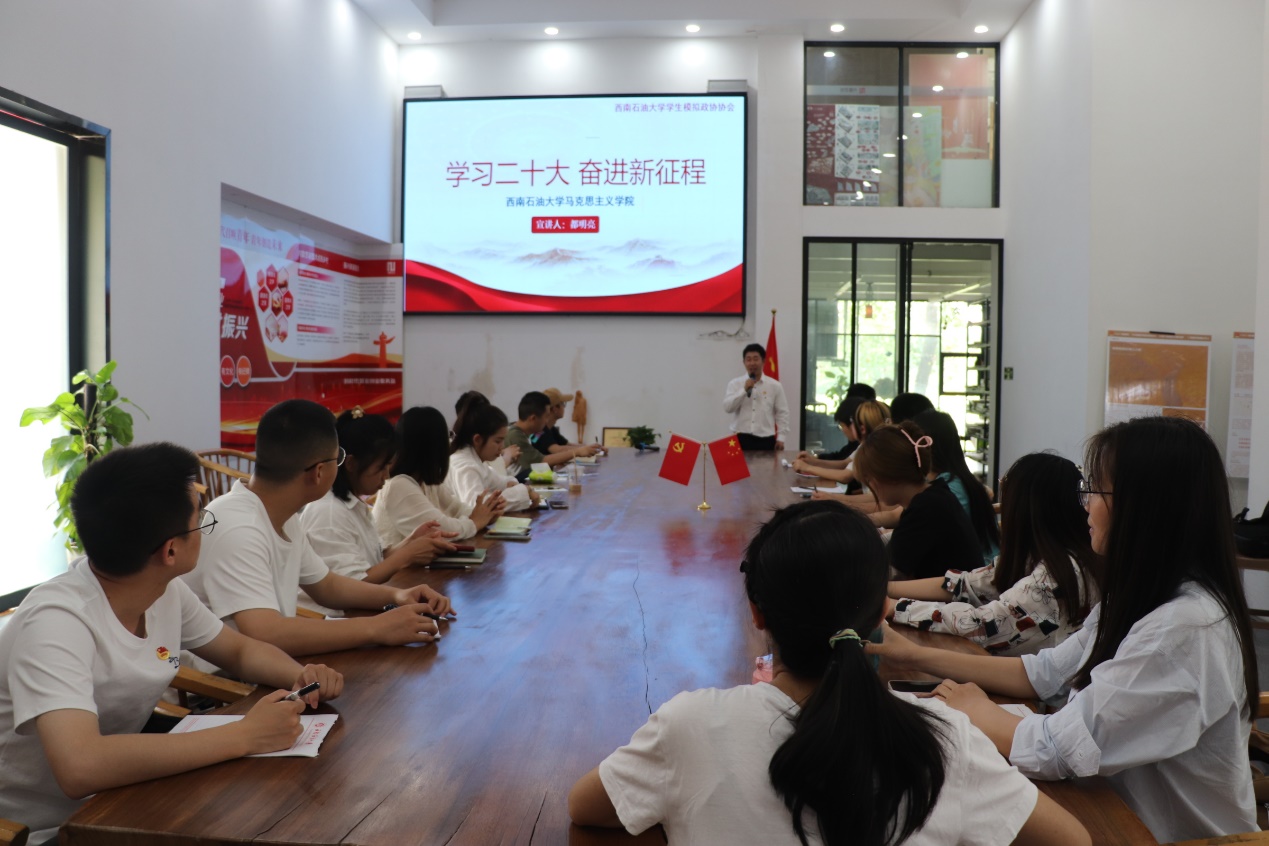 为持续开展党的二十大精神宣传,强化高校学生对于党的二十大精神的认识。5月19日下午,马克思主义学院硕2021级团支部受邀在川音艺谷开展“学习二十大、奋进新征程”党的二十大精神宣讲。支部宣传委员都明亮主讲,新都区西部计划志愿者与西南石油大学模拟政协协会30余人到场参加。