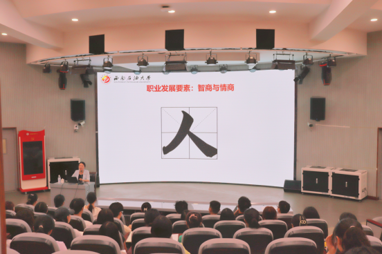 接下来,林莉教授以“大鹏一日同风起,扶摇直上九万里”作为引子,将实现自我成长的两大抓手形象比喻成大鹏的两只翅膀,并指出它们分别是专业知识技能和职业技能。林莉书记从“人”的构造谈起,指出职业能力包括团队合作、职业沟通、人际交往等多个方面,并通过用手臂摆“人”字和与同学亲切交流的方式,生动形象地告诉同学们,有效沟通一定要换位思考,只有站在他人角度思考问题,才能更高效地解决问题。此外,林莉教授通过生活中的具体事例,告诉同学们如何在社会中学会说话,学会应变,学会协调。