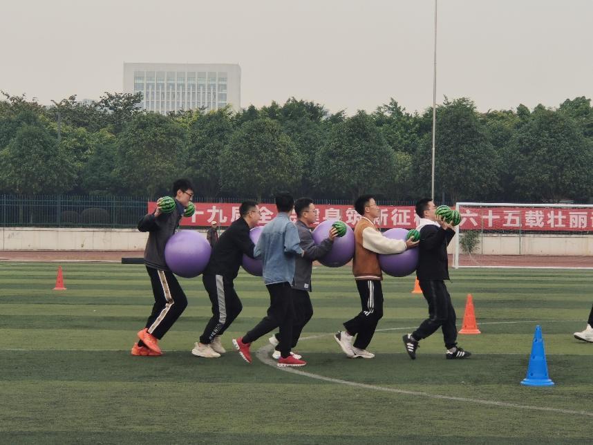 紧张刺激的“夹球运瓜”接力赛现场上,选手们5人一组相互夹球,手持西瓜运往终点。在队友们的密切配合下,各小组顺利完成了比赛任务。