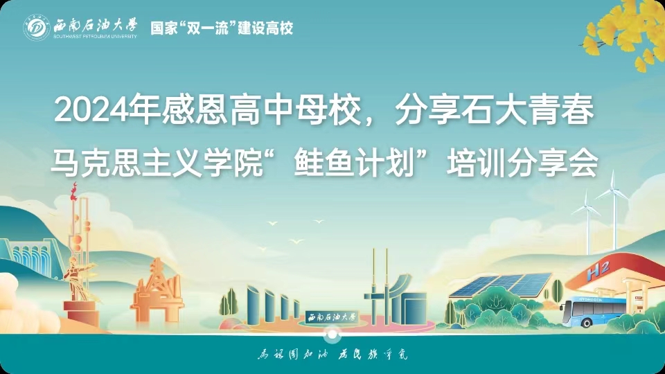 为鼓励学生向母校学子展示我校风貌,提高我校知名度和影响力,马院实践部于2023年11月15晚在线上组织开展“2024年感恩高中母校,分享石大青春马克思主义学院‘鲑鱼计划’培训分享会”马院“鲑鱼计划”成员参会。