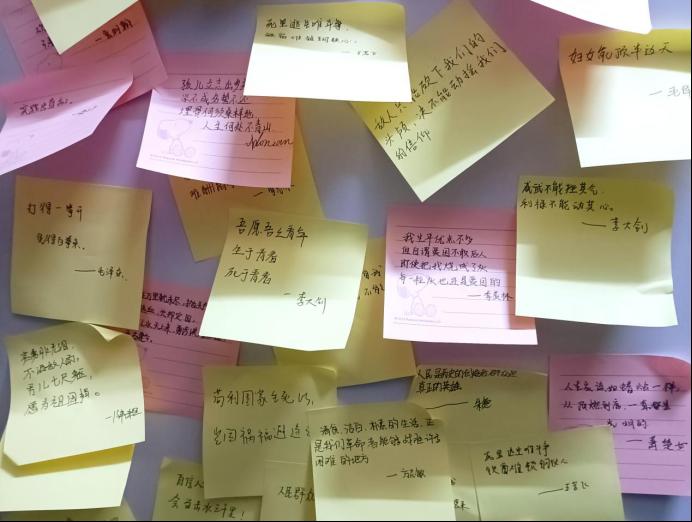活动开始,同学们陆续来到活动地点并积极参与活动,在一张张便利贴上写下自己想要分享的革命先辈名言,希望这些名言能给自己以及他人带来力量,让同学们更好地去铭记历史、缅怀先辈。同学们写下的便利贴很快便贴满了展示白板,吸引不少其他同学前来观看与参与。