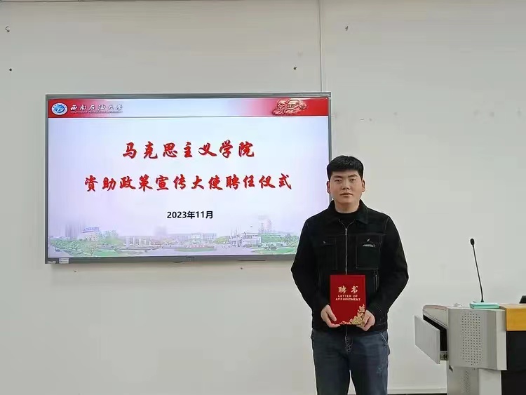 仪式上,国家奖学金得主扈帅军和宋永伟被正式聘为资助政策宣传大使。他们不仅在学业上取得了显著成就,而且在推广资助政策方面表现出了极大的热情和责任感。作为马院学子的优秀代表,他们的成就和贡献不仅激励着同学们追求学术卓越,也为大家树立了积极参与社会活动的良好典范。