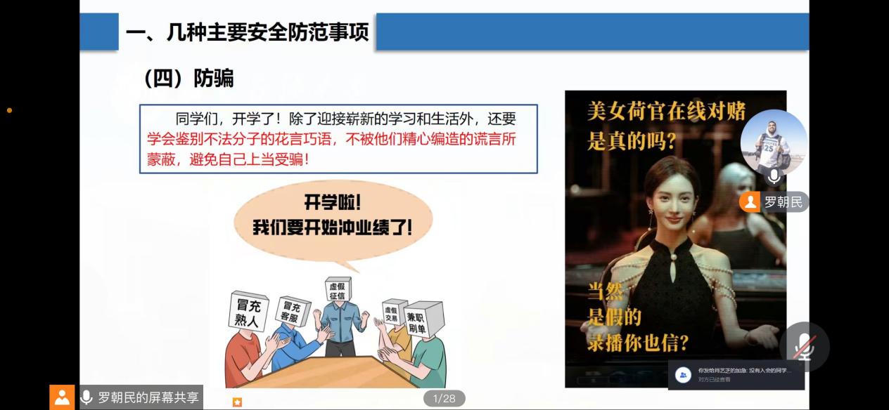会议上,罗朝民围绕寒假安全、法纪和健康三个方面展开。介绍了寒假放假的时间安排和离校、留校的管理流程。提醒学生要做好宿舍水电检查,锁好门窗,以确保宿舍财物安全。假期期间,在享受假期的同时要做好交通安全、防范电信诈骗、关注心理健康、意识形态安全、假期人身财产安全、食品安全等重点工作,保持健康的生活方式等,并结合近期典型事例,教育全体学生在假期期间做好各类安全防范工作。
