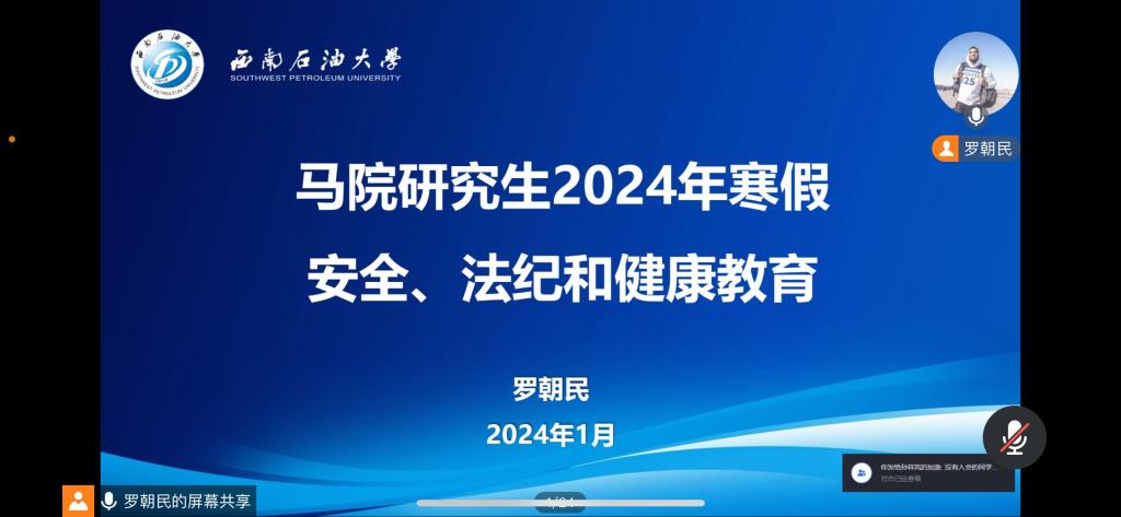 2024年1月18日下午,马克思主义学院在线上组织全体研究生召开了以寒假安全、法纪和健康教育为主题的线上会议。会议由研究生辅导员罗朝民主持,全体研究生参加。