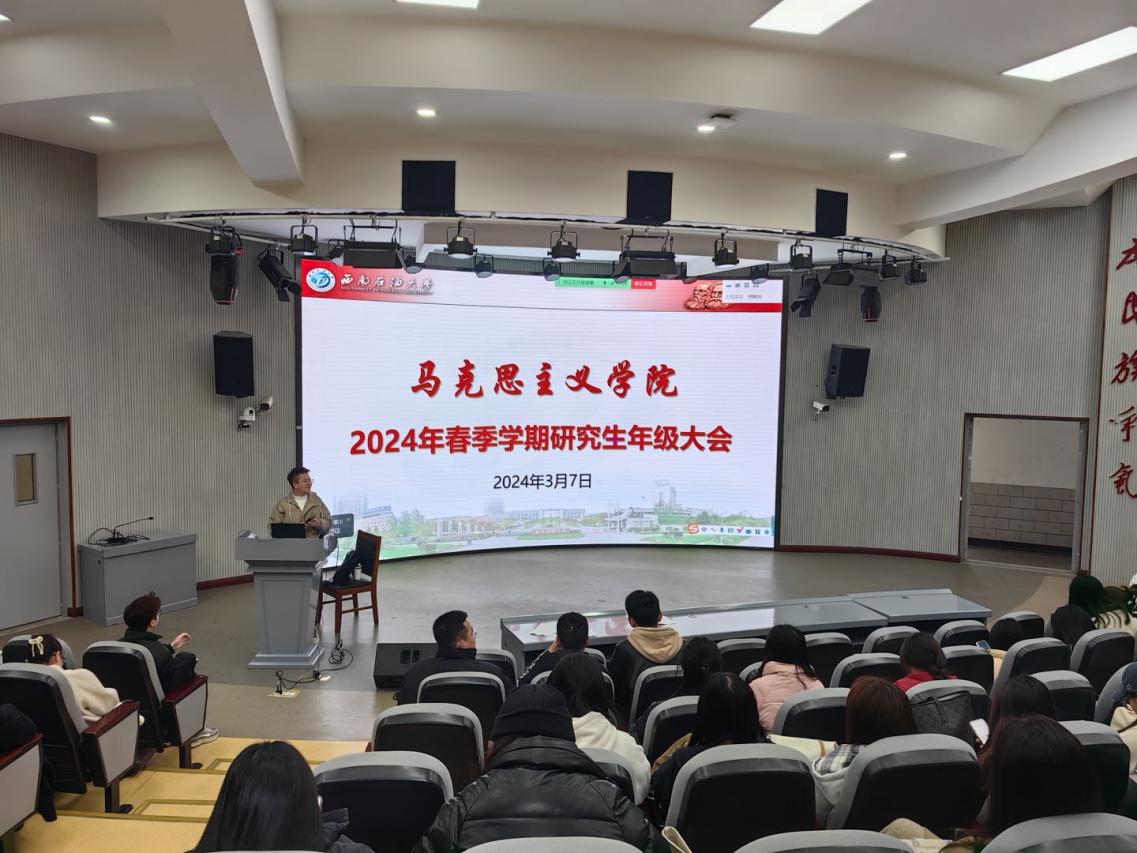 2024年3月7日上午,马克思主义学院在思学楼C110召开了以毕业班相关工作讲解、开学安全第一课等为主题的年级大会。会议由研究生辅导员罗朝民主持、学院全体研究生参加。
