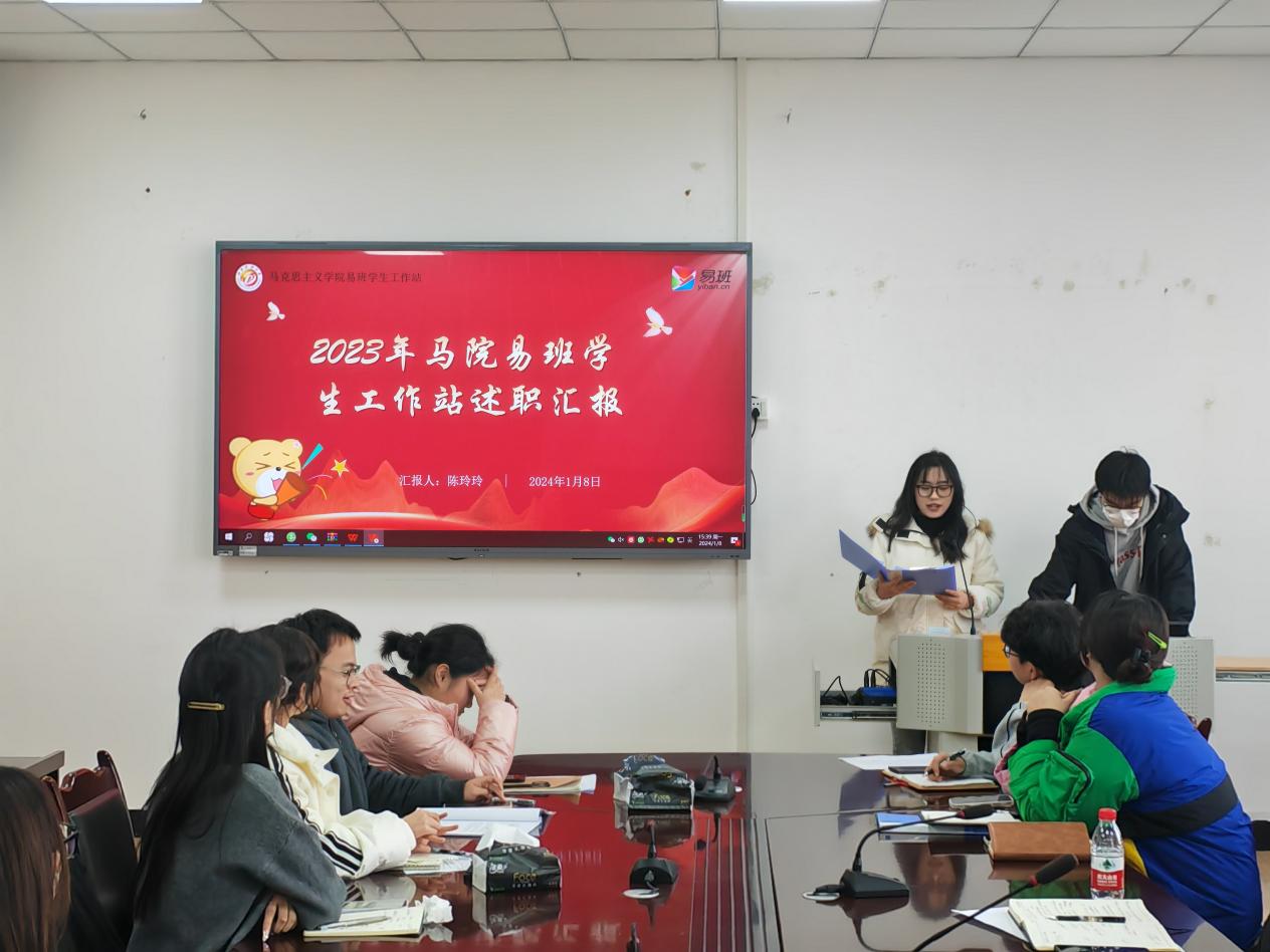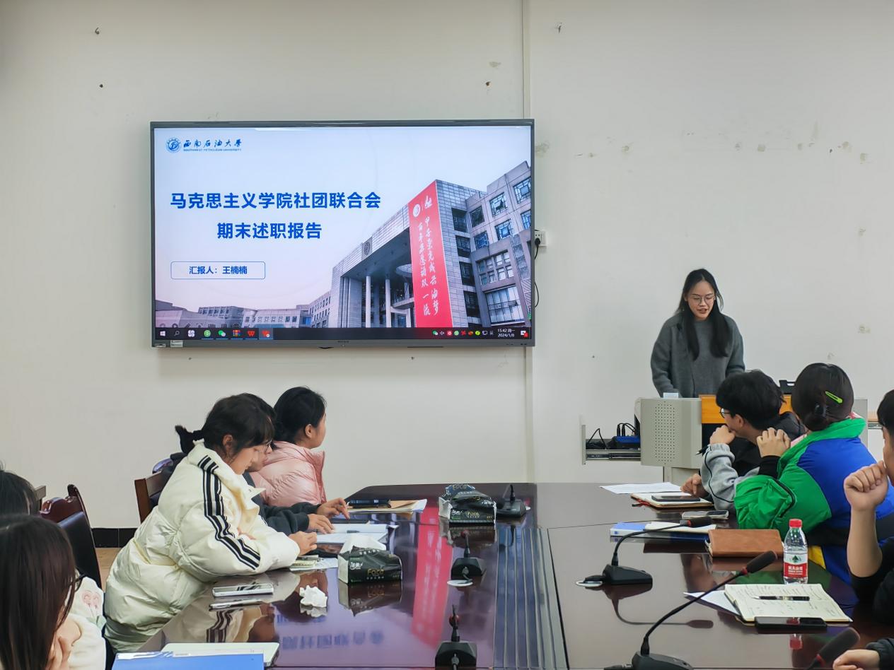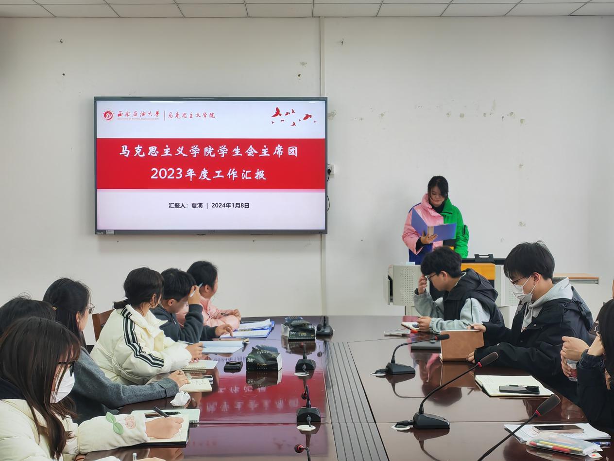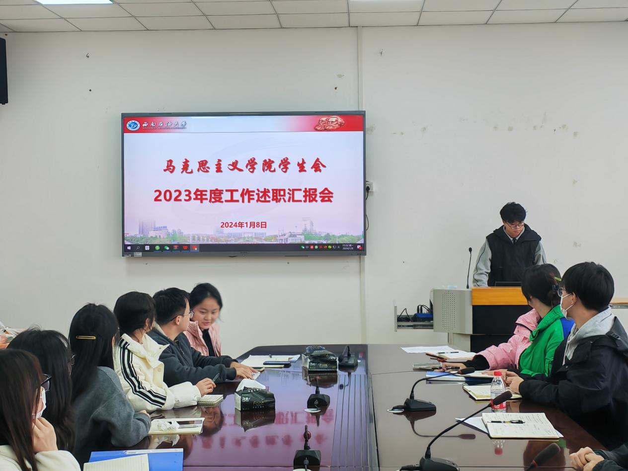 2024年1月8日下午,马克思主义学院学生会在思学楼D507会议室召开2023年度工作述职汇报会。学院学生会指导老师李锦韬,学生会、团总支下属部门、学生社团联合会、易班学生工作站全体成员,各班级团支书、班长及学生代表参加会议。会议由学生会秘书处负责人程铭杨主持。
