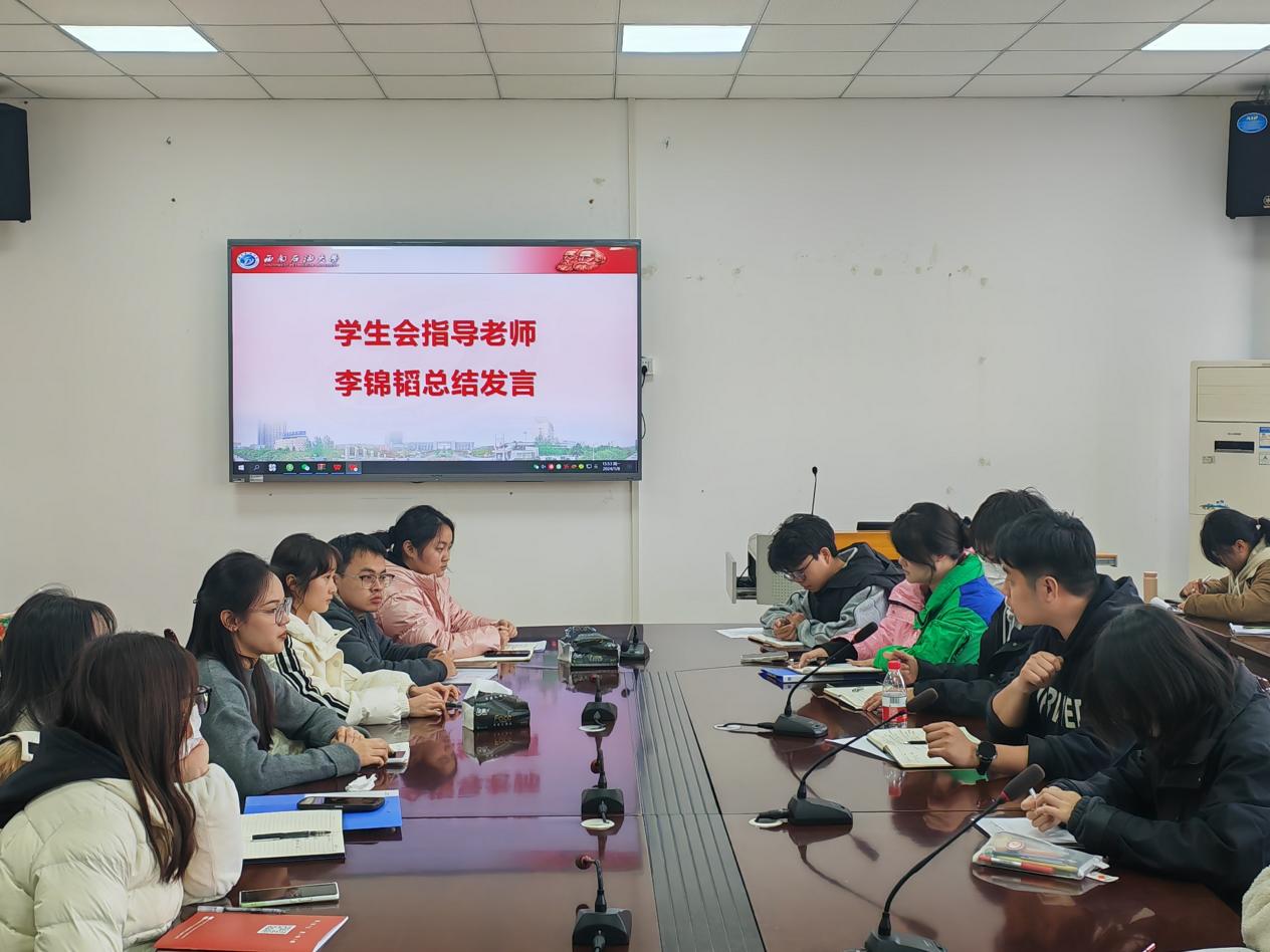 最后,学生会指导老师李锦韬作总结讲话。李锦韬充分肯定了2023年各部门的工作成效,对同学们的辛勤付出表示感谢。李锦韬对各部门下一步工作提出四点要求:一是要拓展工作广度,扩大学生活动的覆盖面,充分发挥学生会的引领作用;二是挖掘工作深度,深入各年级学生群体,满足同学们的发展需求;三是提升工作高度,打造更多学生品牌活动,展现马院自身特色和学科特点;四是增强工作联动性,积极主动联系校内各级学生组织,提升学生活动影响力.