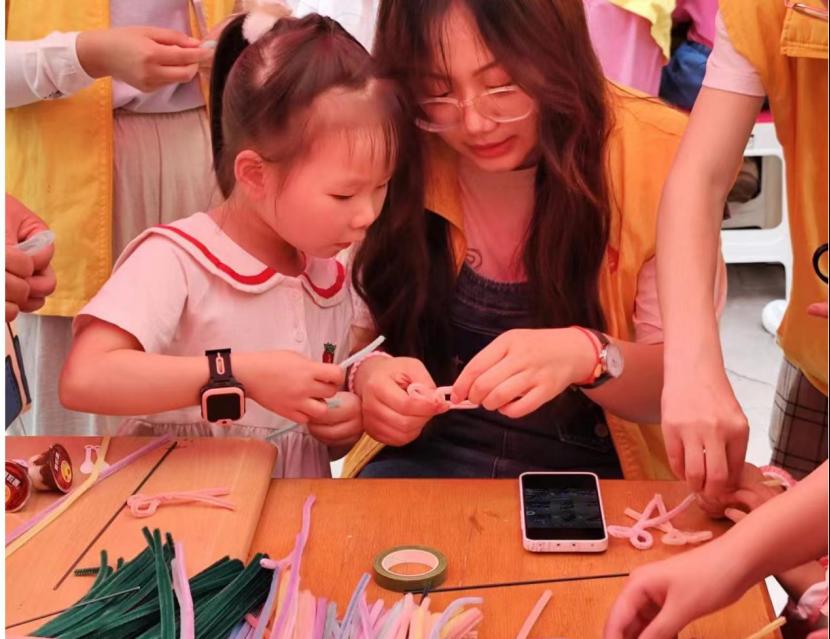活动在童真与青春交织的欢乐氛围中拉开序幕。杨妍轲小朋友首先为大家讲述了劳动模范的故事,用稚嫩而有力的声音号召全体小朋友用行动书写属于自己的劳动故事。志愿者们也纷纷讲述了自己所了解的劳动模范故事。“‘民生在勤,勤则不匮。’新时代青年当以劳动之光芒,闪耀青春花路;以时代之热情,重燃劳动盛焰”,志愿者徐善意话语铿锵,博得阵阵掌声。在趣味问答环节,小朋友们争相竞答,现场气氛十分活跃。最后,亲子互动手工制作环节推动整个活动达到高潮。小朋友们发挥自己的想象力与创造力,用扭扭棒制作出一朵朵美丽的劳动之花,送给各自最爱的妈妈。母亲们的笑容映在脸上,甜在心底,现场一片其乐融融。