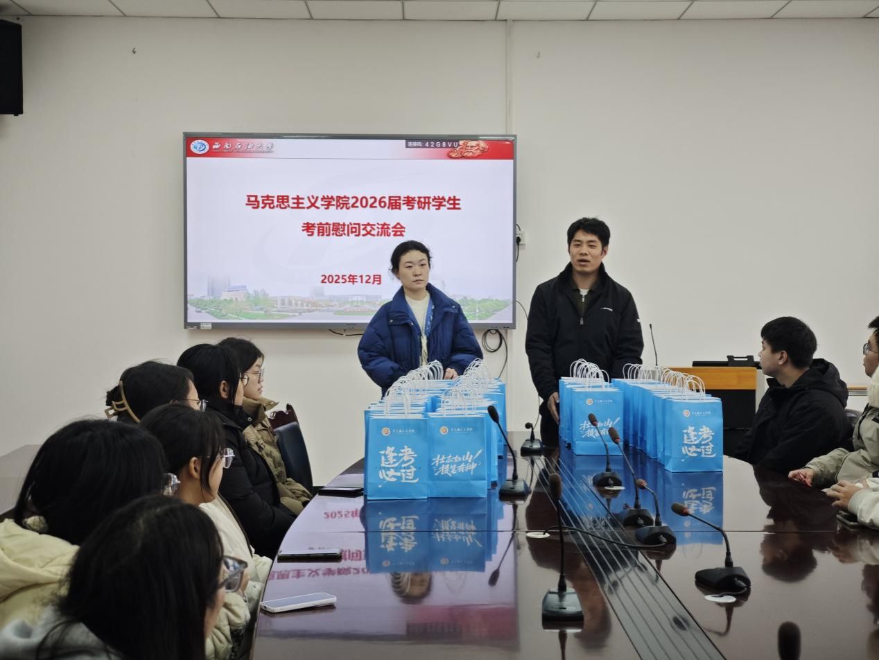2026年全国硕士研究生统一招生考试即将开考,为缓解马院学子备考压力,增强考试信心,12月8日下午,马克思主义学院举行了考研慰问会,传递学院的温暖与关怀。学院辅导员李锦韬、教师代表李晋阳及多数考研学子参会。