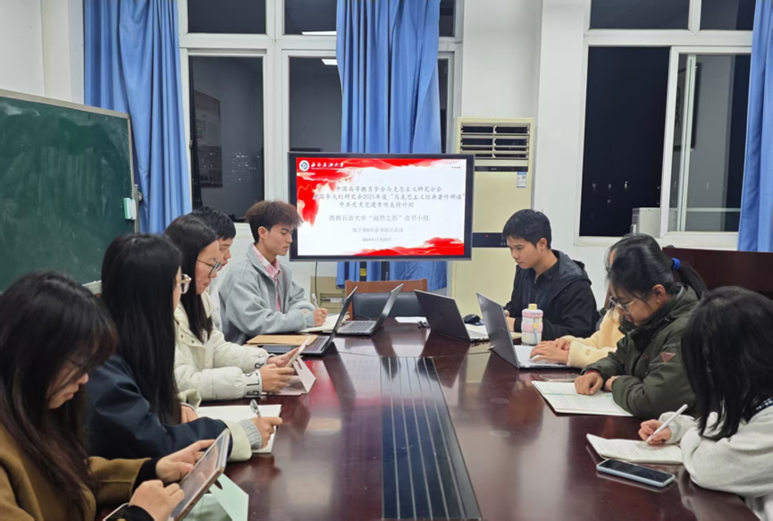 2025年11月23日下午,中国高等教育学会马克思主义研究分会、中国李大钊研究会2025年度“马克思主义经典著作研读”中共党史党建专项支持计划——西南石油大学“阅然知新”读书小组在思学楼d504开展第六次读书研讨会。本次研讨会由成员张彦聪领读,围绕《十八大以来重要文献选编》(下)这一核心文本,深入探讨了“打赢脱贫攻坚战的决定”、“推进全面从严治党”、“推进一带一路建设”等多个关键主题。