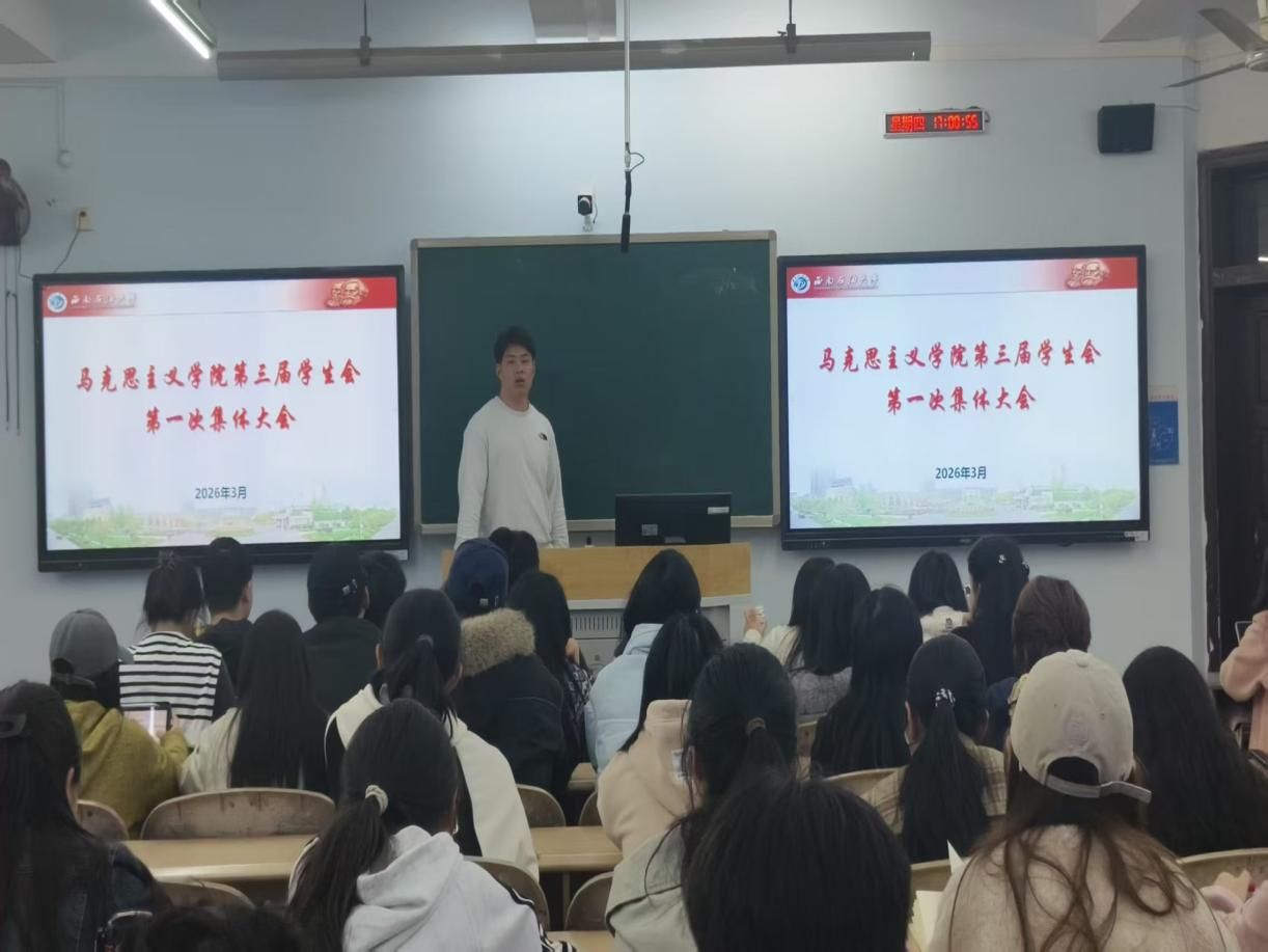 为总结过往工作经验、明晰新学期发展方向,凝聚学生会成员向心力与战斗力,2026年3月12日,马克思主义学院学生会于思学楼C208顺利召开2025-2026学年春季学期第一次集体大会。学院团委书记、学生办公室主任李锦韬及全体学生会成员参会,会议由学生会组织统筹、有序开展。
