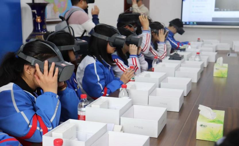 研学之旅第一站:西南石油大学马克思主义学院。借助VR设备,让香城中学学生在活灵活现的虚拟环境中,沉浸式体验红色文化数字资源,真切感受马克思主义学院特色课程,详细了解马克思主义、中国近现代史的相关知识。