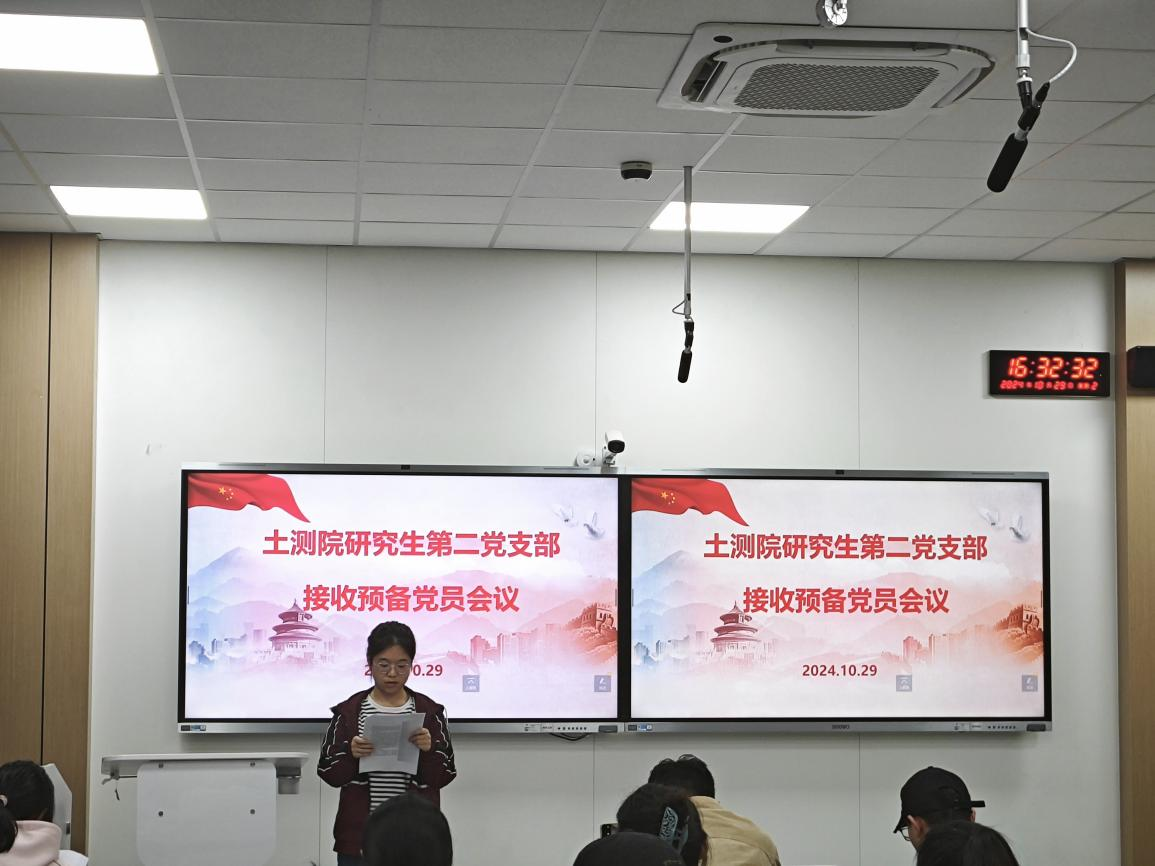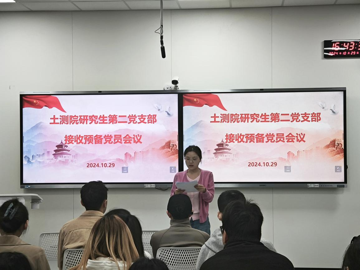 2024年10月29日,土测院研究生第二党支部召开支部大会,讨论杨思迪、范艺、唐祥伟、甘宇四位同志的入党问题,并举行新党员入党宣誓仪式。