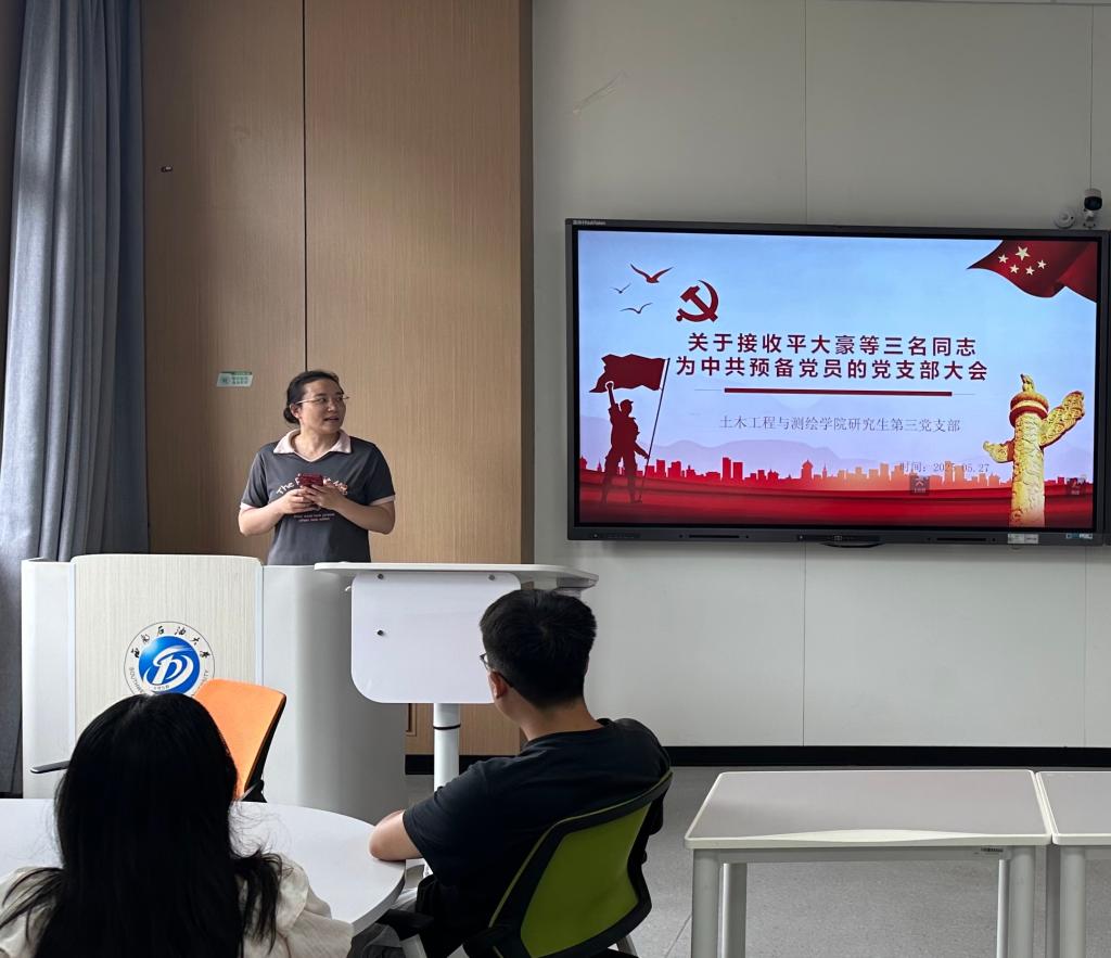2025年5月27日16.30,研究生第三党支部在明志楼A305会议室举行了一场庄重而严肃的支部大会,专题讨论并审议了平大豪、杨佳芳、黄瑶三位同志的入党申请。会议由支部副书记邱月同志主持。