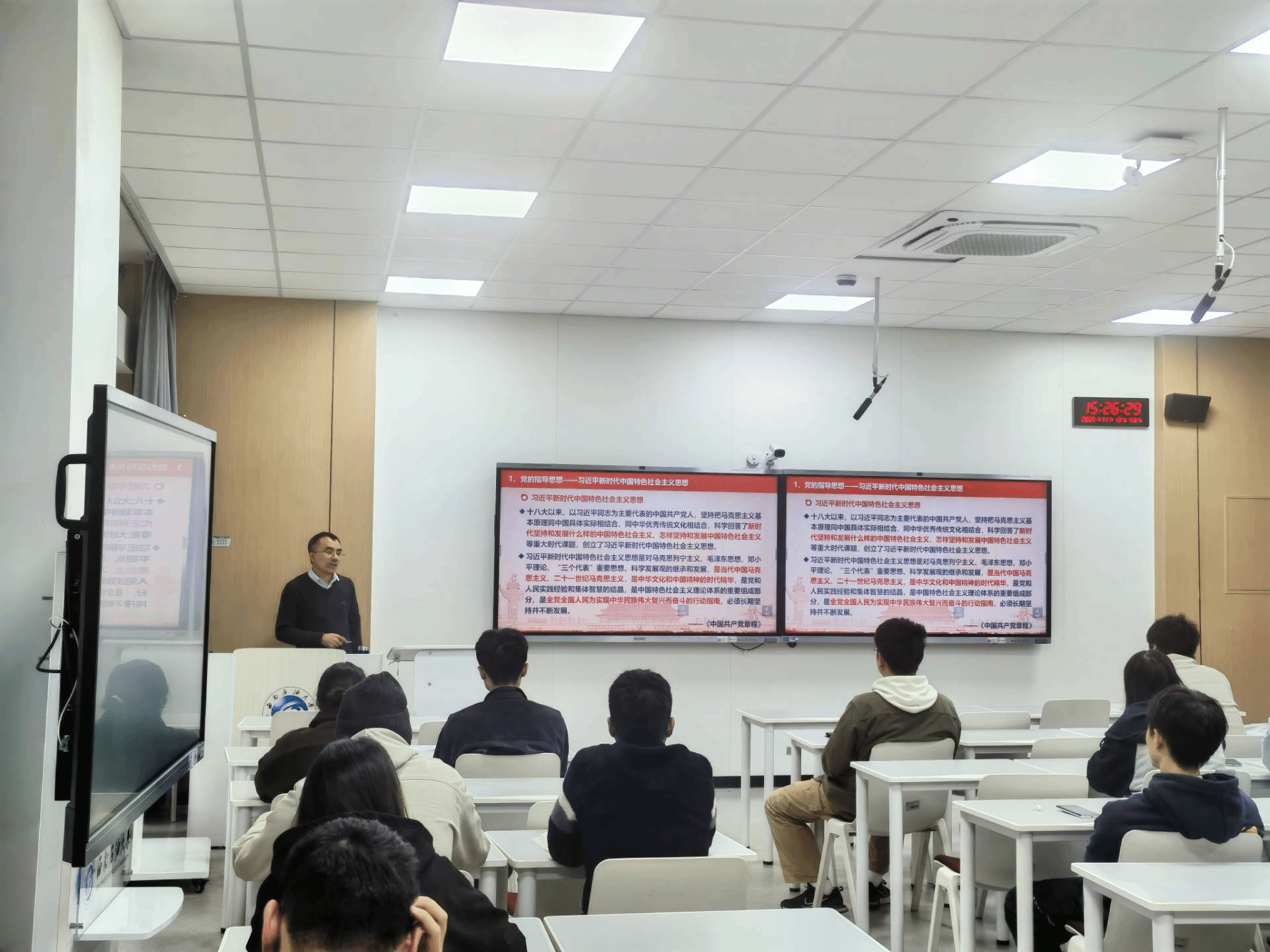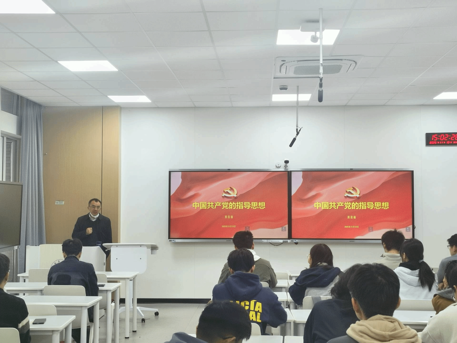 党课开始,熊俊楠教授开宗明义地指出:“作为新时代青年,只有思想端正,理论扎实,才能成长为一名合格的建设者、接班人。”他强调,对于个人而言,指导思想是行动指南,是引领人生发展方向的旗帜;而对于政党而言,指导思想是政党的灵魂,是政党一切纲领政策的源头活水,更是凝聚力量、指引实践的根本遵循。随后,熊教授系统梳理了马克思主义中国化的两大理论成果:毛泽东思想和中国特色社会主义理论体系。详细阐述了毛泽东思想、邓小平理论等重要思想的内涵与时代价值,在此基础上,他重点介绍了马克思主义中国化的最新理论成果---习近平新时代中国特色社会主义思想,深入解读其形成背景、核心要义和实践意义。熊教授指出,进入新时代,我国迈入了新的发展阶段,社会主要矛盾发生转化,奋斗目标实现历史性跃升。二十多年来,中国不仅在世界上举住了、举稳了社会主义旗帜,更将科学社会主义推向了一个崭新的发展阶段。