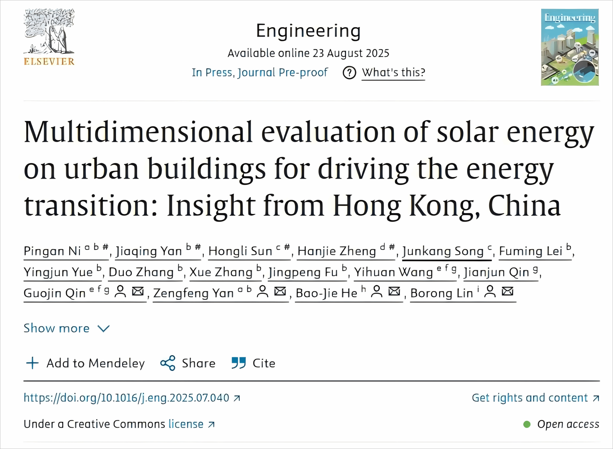 近日,我院建环教研室秦国晋老师作为第一通讯作者、建工教研室王艺环老师为共同作者联合绿色建筑全国重点实验室闫增峰教授团队、重庆大学何宝杰教授团队、清华大学林波荣教授团队中国工程院院刊《Engineering》(IF=11.6)上联合发表题为“Multidimensional evaluation of solar energy on urban buildings for driving the energy transition: Insight from Hong Kong, China”的论文。