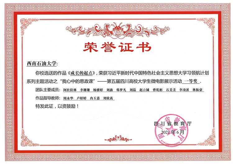 上一条:2021年第六届四川省大学生结构设计竞赛二等奖 下一条:工程管理2020级阿杜拉林等同学获得第五届四川高校大学生微电影展示活动一等奖