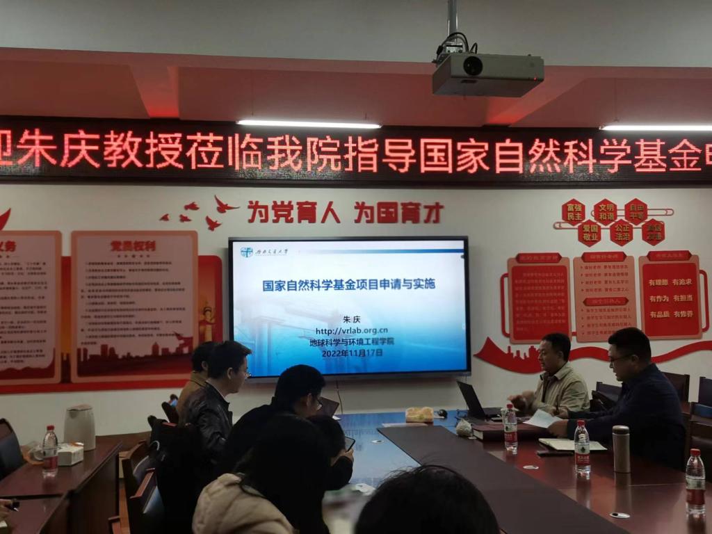 11月17日下午,西南交通大学地球科学与环境工程学院教授、国家长江学者朱庆教授受邀来我院分享了国家自然基金写作与申报经验,本次交流会采用线上及线下会议同步的形式开展。会议由胡启军副院长主持,熊俊楠副院长、肖东升教授等我院20余名教师线下参加了会议。