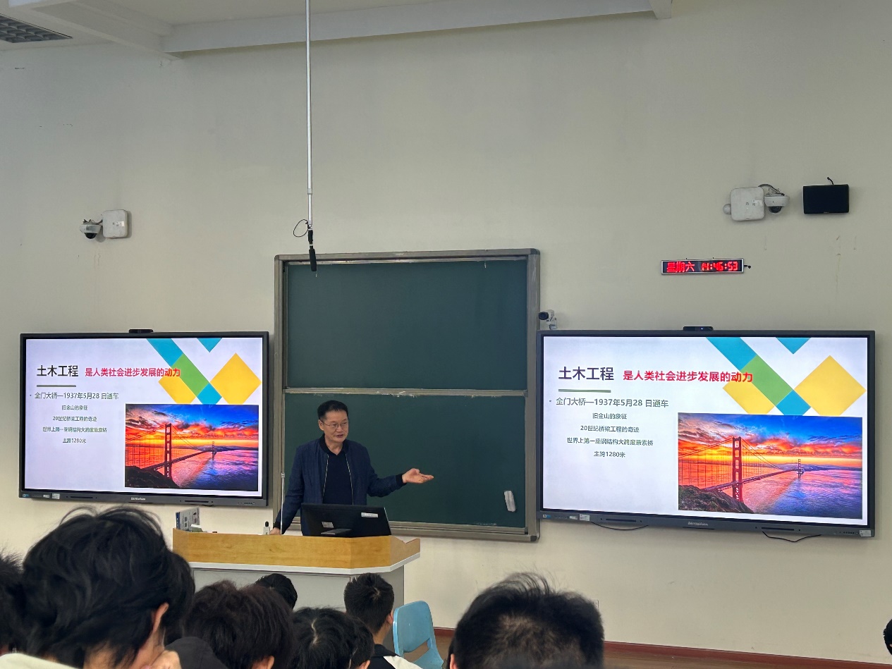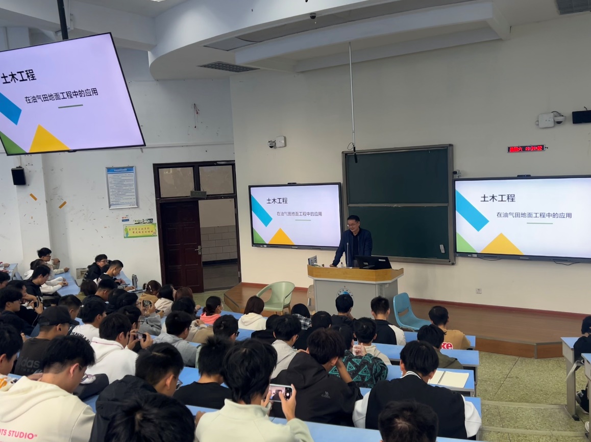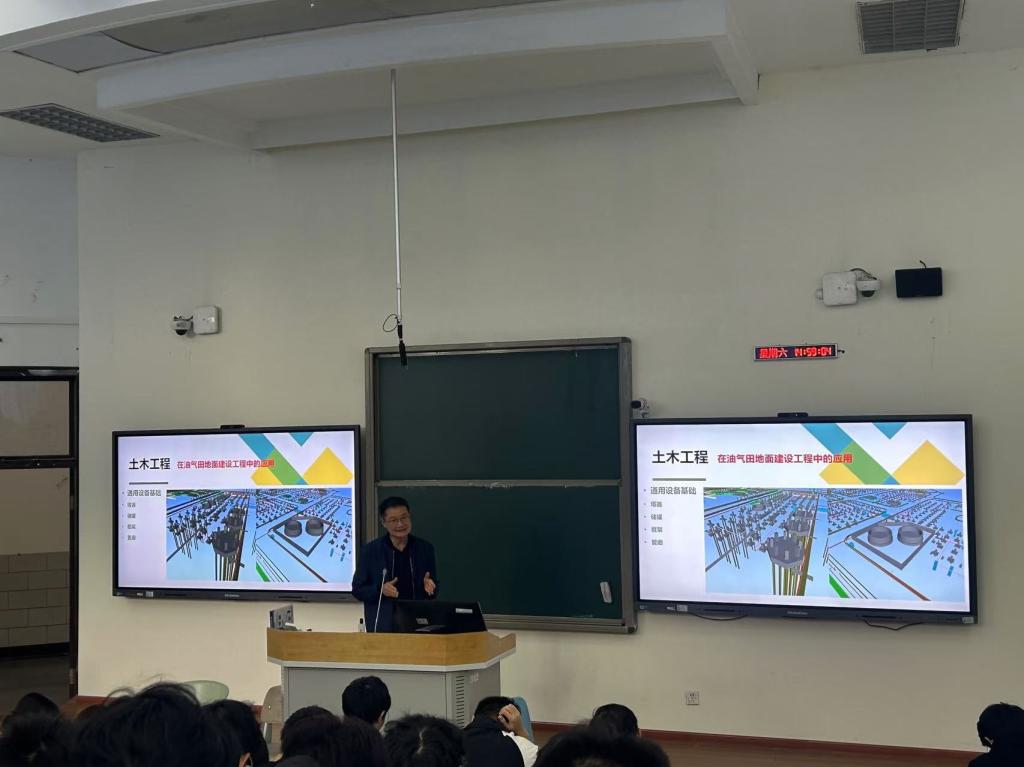 2024年11月2日下午,中石化石油工程设计有限公司副总经理孙晓春应邀在明志楼B110为我院一百余名师生作题为“土木工程在油气田地面工程中的应用”的讲座,讲座由学院院长甘丹主持。