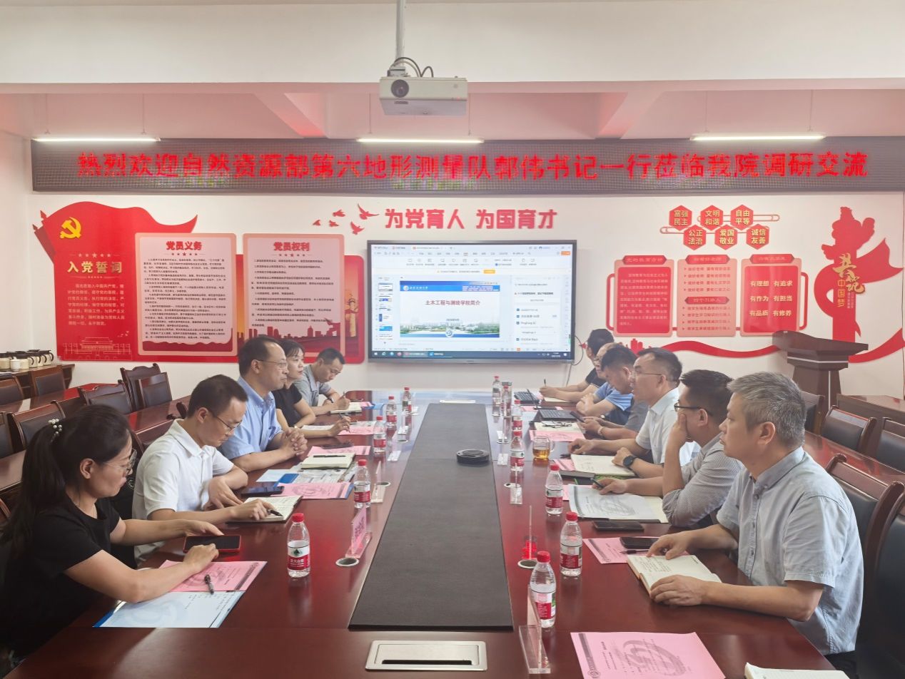 9月8日下午,自然资源部第六地形测量队党委书记、大队长郭伟一行到访我院进行交流座谈。随行人员包括党委委员、副大队长王萍,空间中心主任李炼,地下管线勘测分院副院长杨武,空间中心高级工程师张金花等。我院党委书记熊俊楠、副院长万旭升、测绘工程教研室书记刘福臻、测绘工程教研室主任贾宏亮、地理信息系统教研室主任汪宙峰等共同参与座谈。