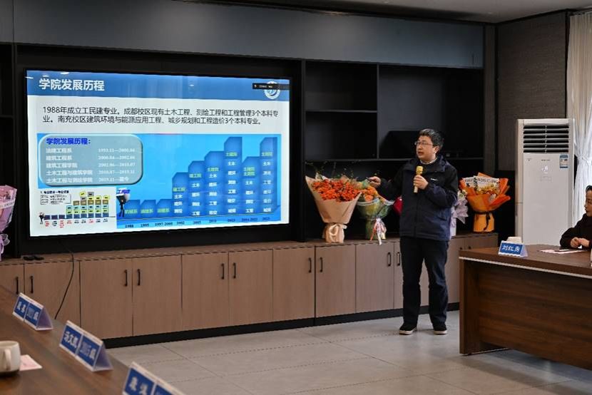 学院院长甘丹教授向校友介绍了学院近年发展概况。目前,学院在新都校区设立的工程管理、土木工程、测绘工程三个专业均已入选国家级一流本科专业建设点;南充校区延伸管理的建筑环境与能源应用工程专业为省级一流专业建设点。学院正全面推进专业建设,土木工程专业已完成工程教育认证(评估)专家进校考查工作。