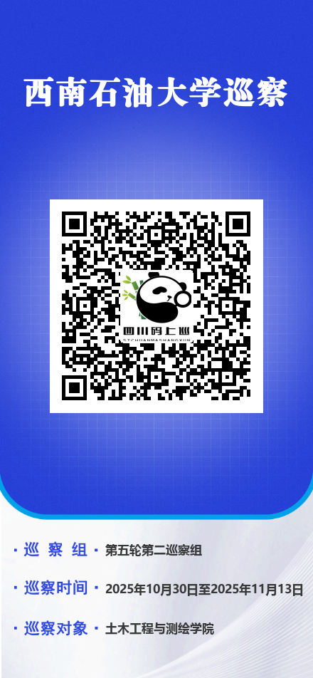 按照校党委要求和巡察工作领导小组安排,校党委第二巡察组从2025年10月30日至11月13日对学院党委开展巡察。根据巡视工作条例和《中共西南石油大学委员会巡察工作办法》规定,巡察组巡察期间受理反映土木工程与测绘学院领导班子及成员、下一级党组织主要负责人等干部问题的来信来访,重点是关于违反政治纪律、组织纪律、廉洁纪律、群众纪律、工作纪律、生活纪律以及违反中央八项规定精神方面的举报和反映。对其他与巡察工作无直接关系的个人诉求,转交被巡察单位和有关部门处理。师生员工如有举报和反映问题的,可以通过电话、电子邮箱、扫描“四川码上巡”二维码等渠道与巡察组联系。