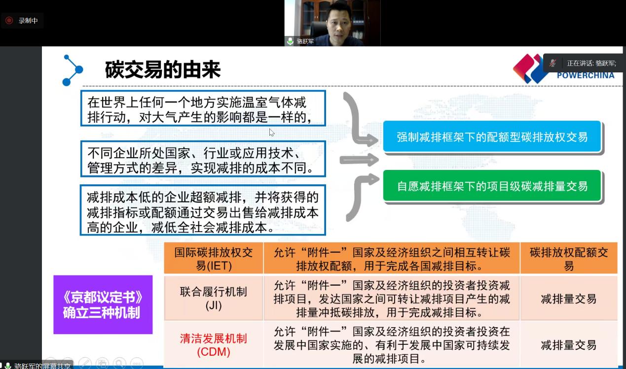 讲座中,骆跃军博士从碳交易原理、碳交易市场进展、碳交易规则和流程、碳排放权配额和碳减排市场等几个方面对该机制进行了全方位剖析。骆博士强调国外碳交易市场已经运行了近20年,而我国从2013年开始启动了8个碳交易试点,在2021年7月开始正式启动全国碳交易市场。此外,骆博士以广东碳交易规则和流程、碳排放权配额为例阐述了碳交易如何运行,揭示了碳交易对企业的影响机制。