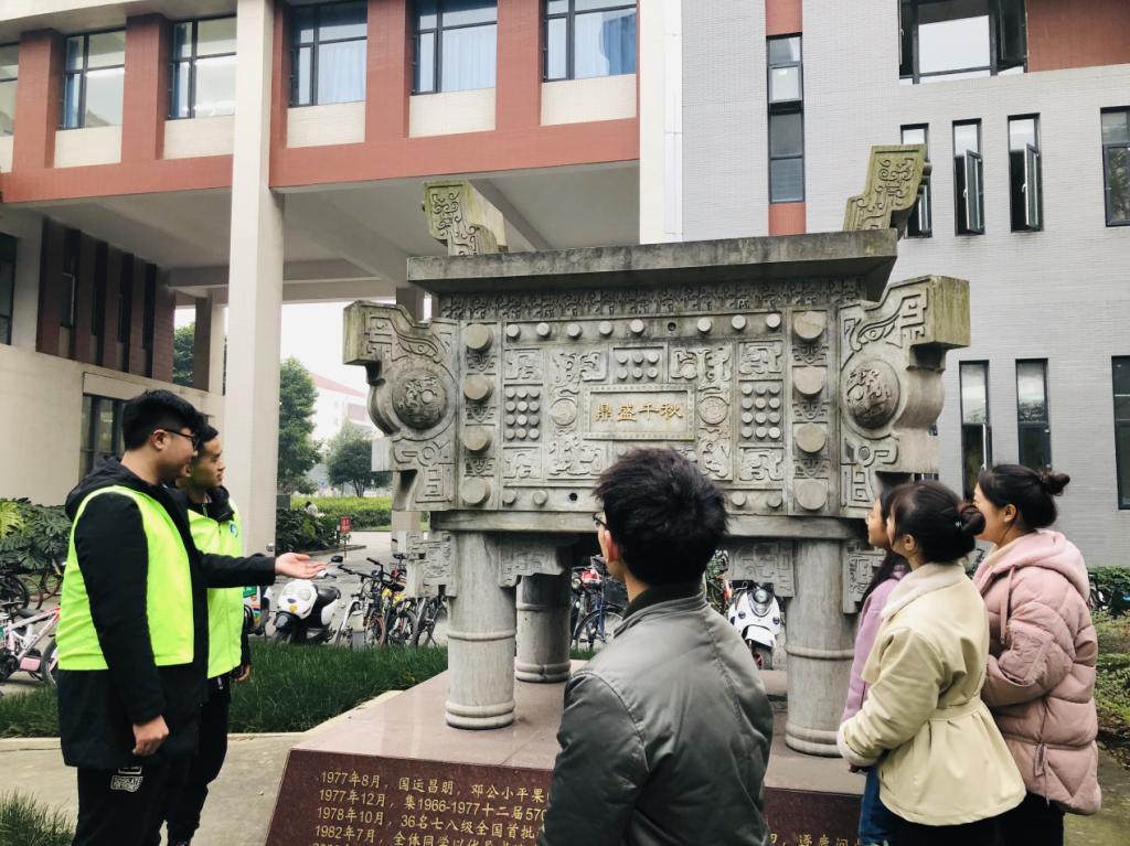 志愿者带领中学生参观明德楼