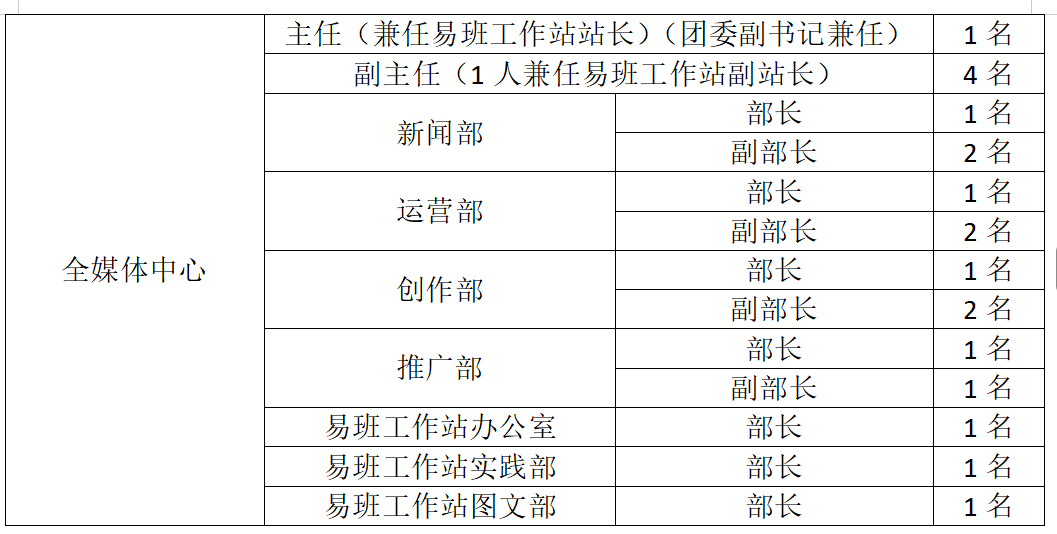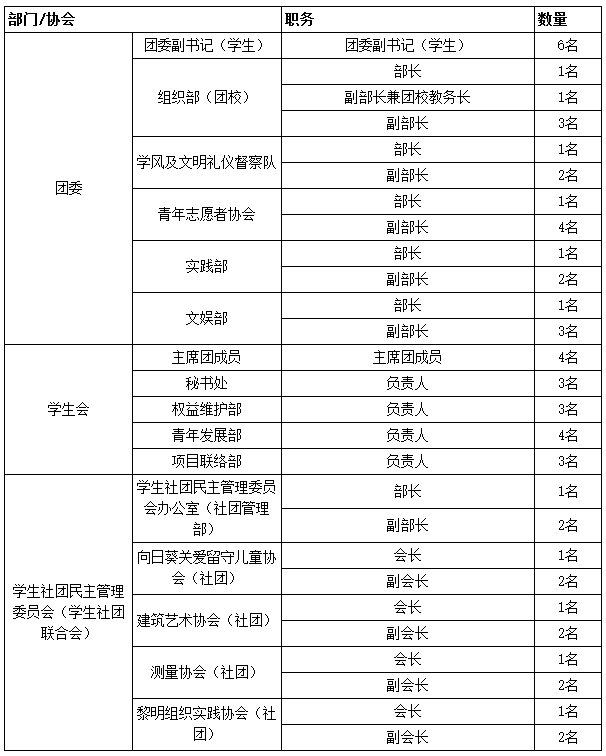 为进一步落实《关于推动高校学生会(研究生会)深化改革的若干意见》的通知精神及《高校学生社团建设管理办法》相关要求,基于团学工作的实际需要,各组织及岗位有所调整(具体岗位设置请见下表)。同时为促进我院团委、学生会、全媒体中心、大学生创新创业俱乐部、招生就业服务部、学生社团民主管理委员会等各项工作顺利进行,保持工作开展的连续性,更好地为同学们服务,现正式启动土木工程与测绘学院第24届团委、学生会、全媒体中心、大学生创新创业俱乐部、招生就业服务部、学生社团民主管理委员会学生干部选聘工作,具体事宜通知如下: