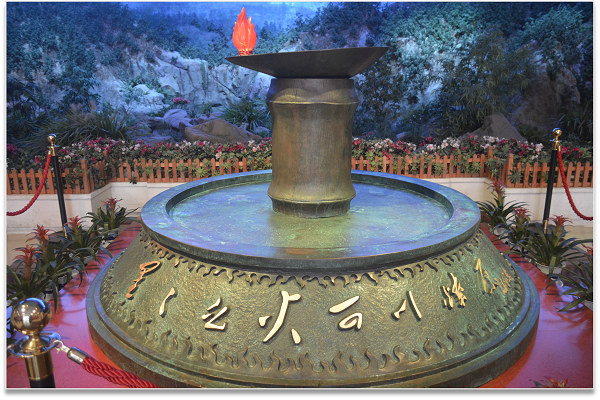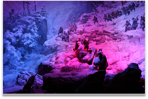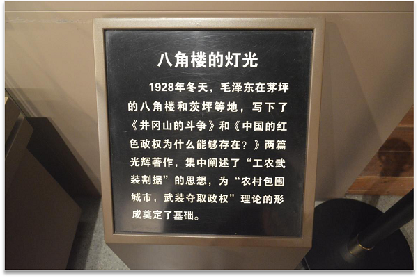 馆内运用真人比例幻影成像,为我们重现了当年毛主席、贺子珍在八角楼生活工作的情景,巧妙穿插了“一根灯芯”和“小太阳”的故事,通过录音以及立体投影,曾经只是以文字形式记载于书本的历史,也在现代科技的协助下,更加栩栩如生,深入人心。场馆内还有许多逼真场景,如:朱毛会师、红军洞、黄洋界保卫战等,都通过人物雕像的刻画以及背景投影结合,真实地为我们再现了一个又一个震撼人心的场面。