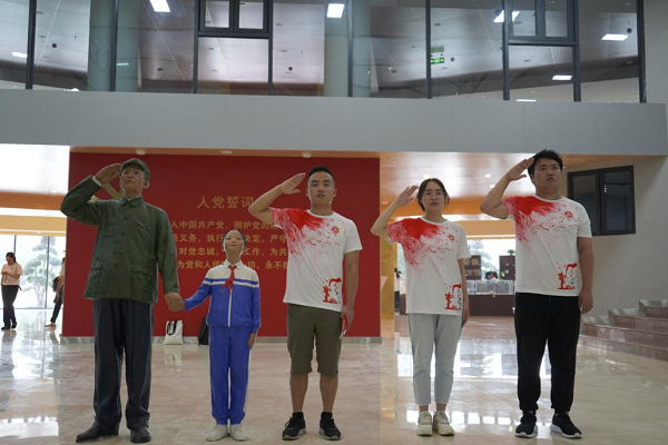 图为实践队员在馆内拍摄党史学习视频