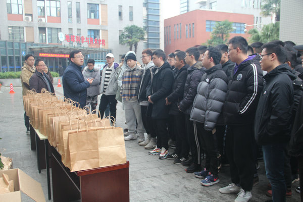 下午三点整,天空中有点小雨,本次派发活动在邵永波院长的祝福中正式开始了。首先,邵永波院长祝考研同学们能有一个理想的成绩,然后开始给同学们讲学术诚信的例子,从大学老师如何做到学术诚信,如果不能做到学术诚信的严重后果,又以一个极其优秀的学长,因为考试诚信问题,留下了处分在档案中,导致在许多次寻找工作中,都为此吃了亏。随后邵永波院长又为同学们考研的学习方面进行了引航,告诉同学们在学习中有任何不懂的问题都可以找他进行帮助,会对同学们的专业知识上寻找老师进行解答,并告诉同学们身体是革命的本钱,考研的复习也需要注重劳逸结合,注重学习方法和学习心态,更要保重身体。在周永华书记关心同学们身体和学习状况后,分发加油礼包活动正式开始了。大礼包包含香蕉、苹果和手写的祝福卡片,寓意是祝考研学子们“心‘香’事成,心‘苹’气和,不‘蕉’不躁,定成硕果”。每一位领到加油礼包的同学都对老师表示了谢意,脸上也同时洋溢着笑容。
