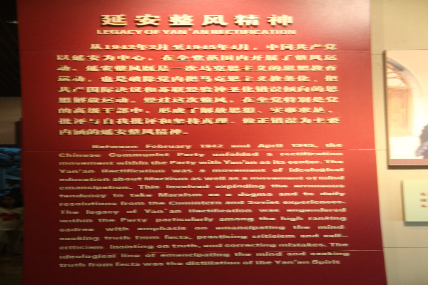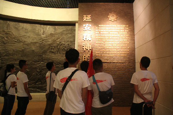 延安,是中国革命的圣地。纪念馆始建于1950年(另于1973年重建新馆),位于宝塔区西北延河东岸,是中华人民共和国成立后最早建立的革命纪念馆之一,整个纪念馆外观朴素大方,结构紧凑,高大宏伟,具有传统的民族风格。首先映入队员们眼帘的是广场中央巍然耸立的毛泽东雕像,基座上布有展示江泽民总书记手书的“毛泽东在延安”字样。展馆正门上方悬挂着红色匾牌,其上有郭沫若1971年来延参观时题写的馆名。纪念馆内有6个展厅,展厅是展示展品的具体载体。展厅大门前有三个大花坛,花草拼成的“实事求是”4字鲜艳夺目。展厅展出大量珍贵的革命文物,再现了毛泽东、刘少奇、周恩来、朱德等人当年在延安的光辉业绩。