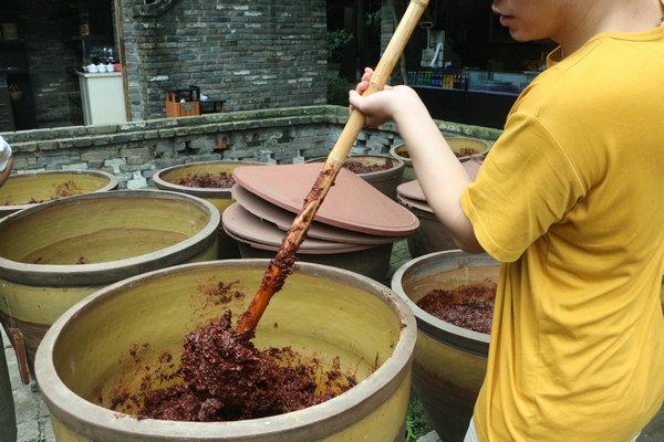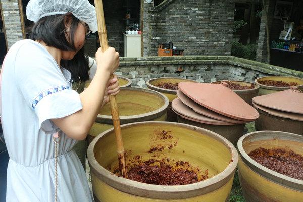 在讲解员的带领下,队员们首先在典藏馆中观看了川菜古董精品,了解了与四川名人有关的饮食故事,比如苏东坡与东坡肉、李调元与凤凰蛋、曹丕与九宫格火锅、还有李白与剑南春烧酒等。随后,队员们在互动演示馆观看了厨师对川菜制作技艺的演示;在品茗休闲馆内品茶,感受了四川的茶文化;在灶王祠观看祭祀礼,体会到了四川传统文化的多样性。最后实践队员还亲身体验了川菜之魂——正宗郫县豆瓣的古法制作,品尝了正宗的豆瓣和豆豉,唇齿留香,念念不忘。