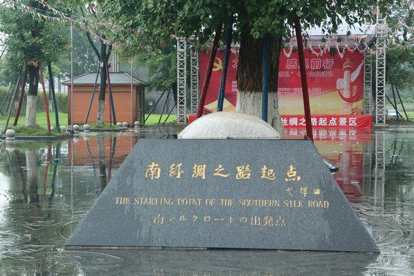 绕过聚合各类民间艺术制品、传统工艺文化的手工记忆一条街,实践队员们前往了丝绸文化主题公园。这个主题公园是以丝绸文化为主题,以蚕桑丝绸的文化演绎为景观轴线打造的园林景观,其通过栽桑养蚕互动、缫丝织绸互动、蜀锦蜀绣体验等给游客呈现全新的互动游玩体验。尽管飘着小雨,没能亲身体验互动,但队员们仍从其充满丝绸文化的气息中体会到了浓浓的传统情怀。