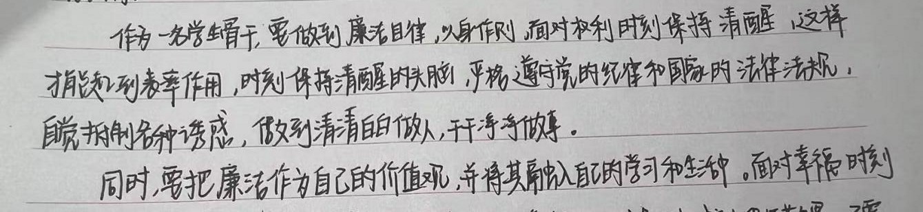 课程结束后,大家都深有感悟。周永华老师热情而生动的讲述感染了在场的同学们。廉洁是一种境界,廉洁是一种品质,廉洁是一份担当,廉洁更是一份力量,同学们纷纷表示自己会坚守心中的底线,树立正确的价值观和道德观,增强法律意识,严格要求自己,接受监督,保持健康的生活方式。相信经过本次课程,土木工程与测绘学院新一批“青马骨干”,一定不会辜负学校的重视,必将在做好学生的本职工作的基础上努力为学校、为祖国贡献力量。
