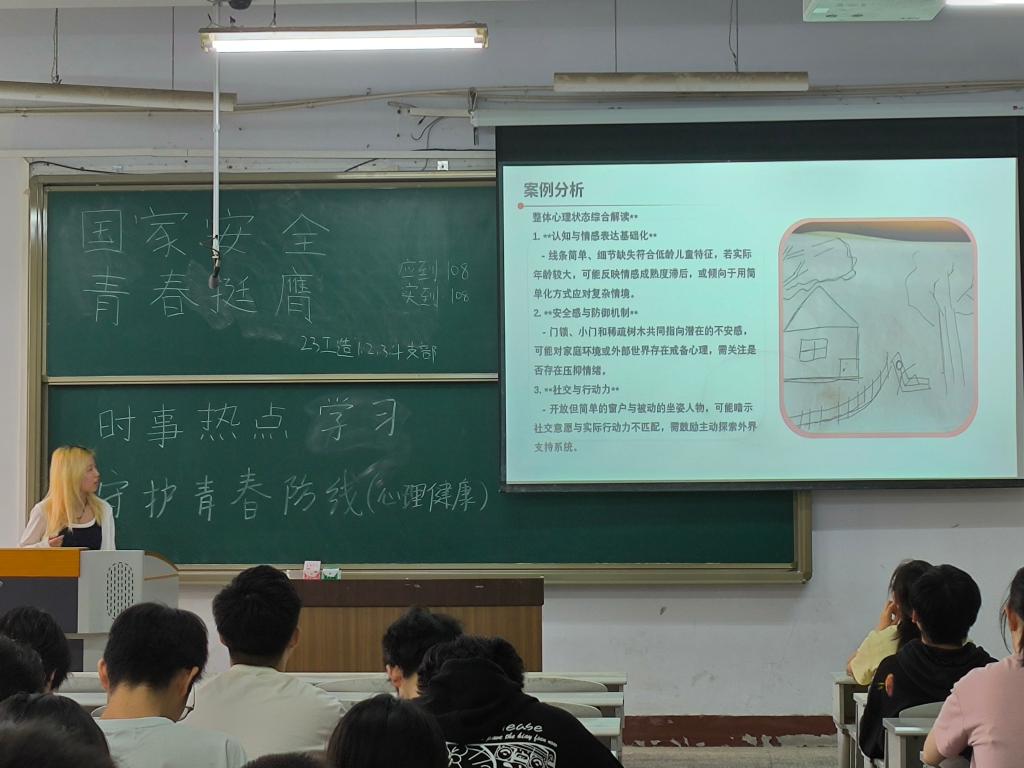 然后,本次团课还关注到学生身心健康,开展“房树人”心理减压,通过绘画探索内心,认识身心健康与国家安全的内在联系,向同学们发出倡议,鼓励大家树立远大理想,增强国家安全意识,关注身心健康,践行“为祖国加油,为民族争气”的大学精神。