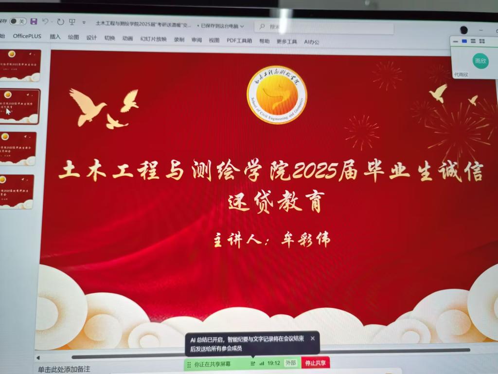 为加强学生的诚信意识和社会责任感,推动国家助学贷款毕业生贷后管理工作顺利开展,帮助毕业生掌握还款知识和流程。6月5日,土木工程与测绘学院(南充)通过线上会议开展了毕业生国家助学贷款还款指导暨诚信教育会。本次会议由学院辅导员牟彩伟主持,2025届全体毕业生参会。