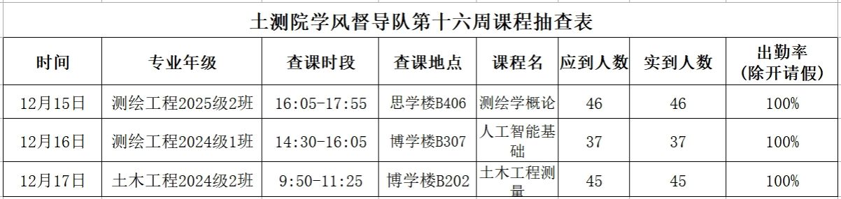 为扎实推进学院学风建设,学院开展"三查三促"专项行动。通过"辅导员-督导队-班委"三级联动机制,对晚自习出勤率、课堂到课率进行全面督查,现将2025年秋季学期第十六周数据通报如下: