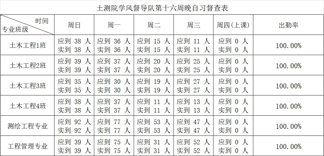2.课堂自查情况:本周学院各班级报送自查情况均为100%,缺席人员已完成相关手续。