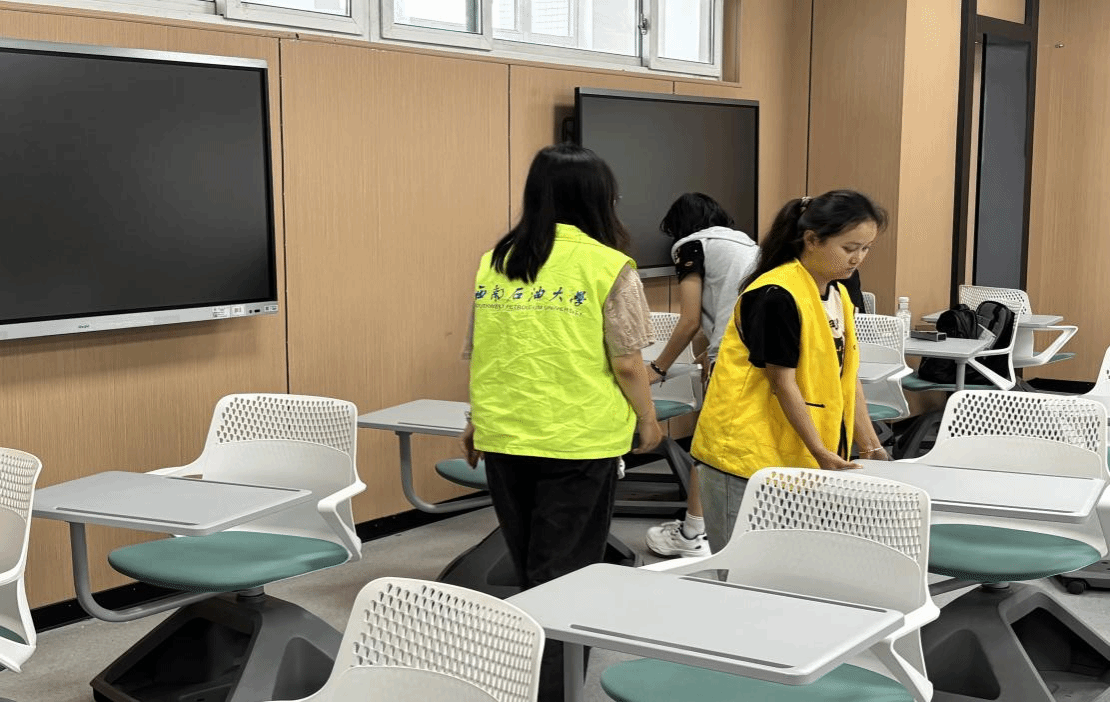 当日下午五点十五,志愿者们提前在明志楼前集合,负责人强调安全事项与工作要求后,按教室划分小组展开清扫。一楼大厅是楼宇“门面”,志愿者们先用扫帚清扫地面灰尘、杂物,对门框、窗台等高处区域,用抹布仔细擦拭。楼梯扶手、栏杆是高频接触部位,志愿者们分组协作,从一楼到三楼逐层清洁,先用湿抹布去除污渍,再用干布擦拭提亮。志愿者们逐间进入教室,将散落的桌椅归位,清理讲台、黑板槽内的粉笔头与杂物。用湿布擦拭黑板及讲台,对投影仪、话筒等设备进行表面清洁。针对教室后排储物柜的杂物,志愿者们分类整理,将废弃物品投放至指定垃圾桶,提醒同学们妥善保管个人物品。
