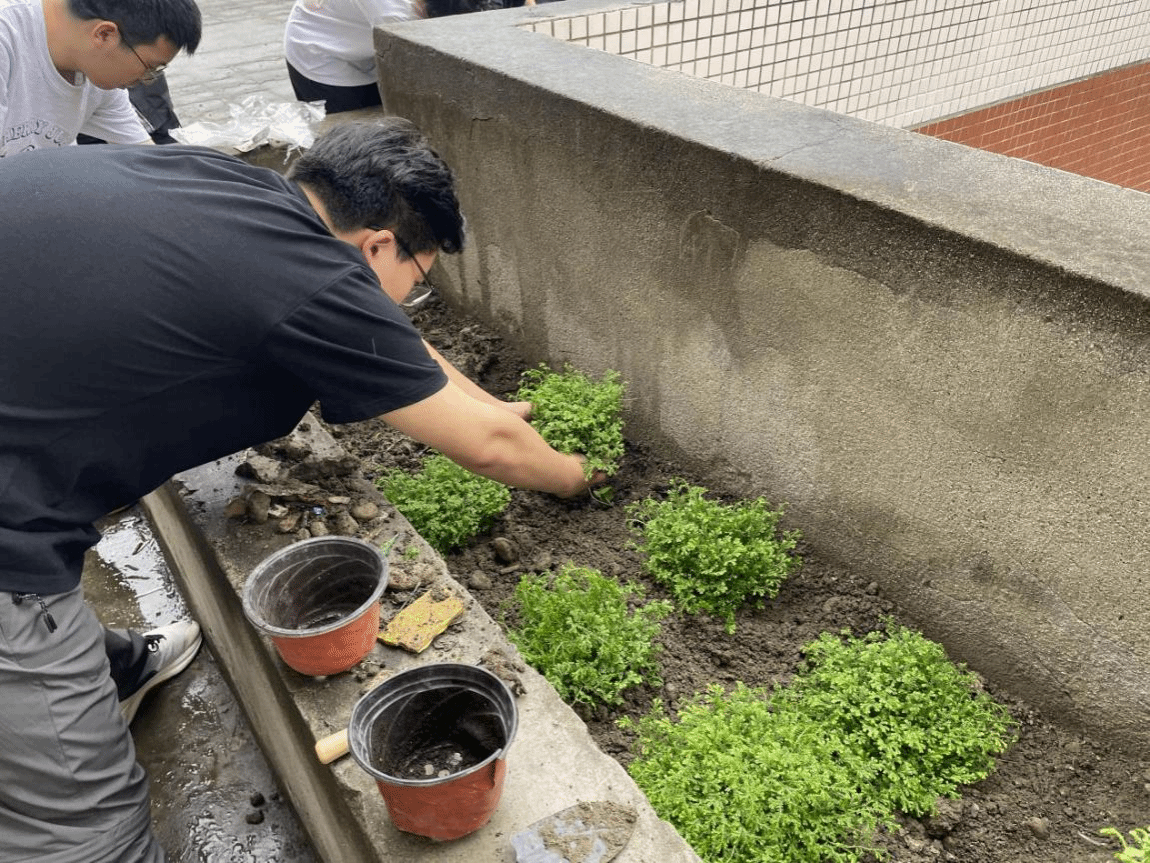活动伊始,吴老师为同学们进行现场种植指导,同学们在吴老师的引导下有序地进行杂草清除和花土搬运等一系列种植前准备工作。之后各小组相互配合,将营养土搬至种植现场,并划定小组种植区域、分取所需种植花卉植物,为后续正式开展种植工作奠定了良好基础。