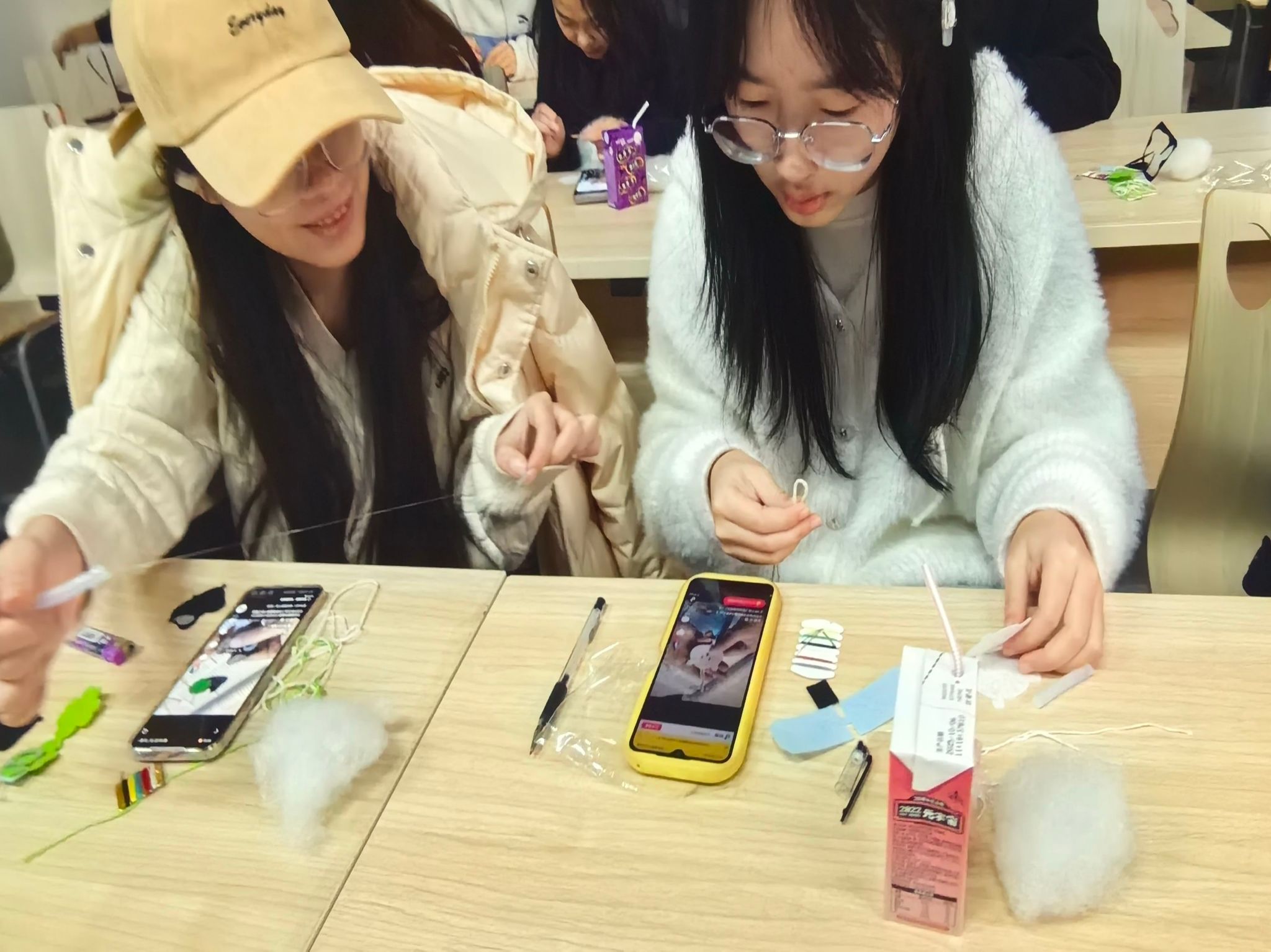 活动现场,各色不织布、纽扣、棉絮等材料整齐陈列,工作人员提前分发剪刀、热熔胶枪等工具,并讲解工具安全使用规范。同学们迅速投入状态进行创作,专注地将不织布裁剪成星星、小动物等造型,通过粘贴、填充棉絮、缝补等步骤,让平面布料逐渐变成立体饱满的挂件。随后,憨态可掬的小熊、神态逼真的小猫等作品纷纷亮相。