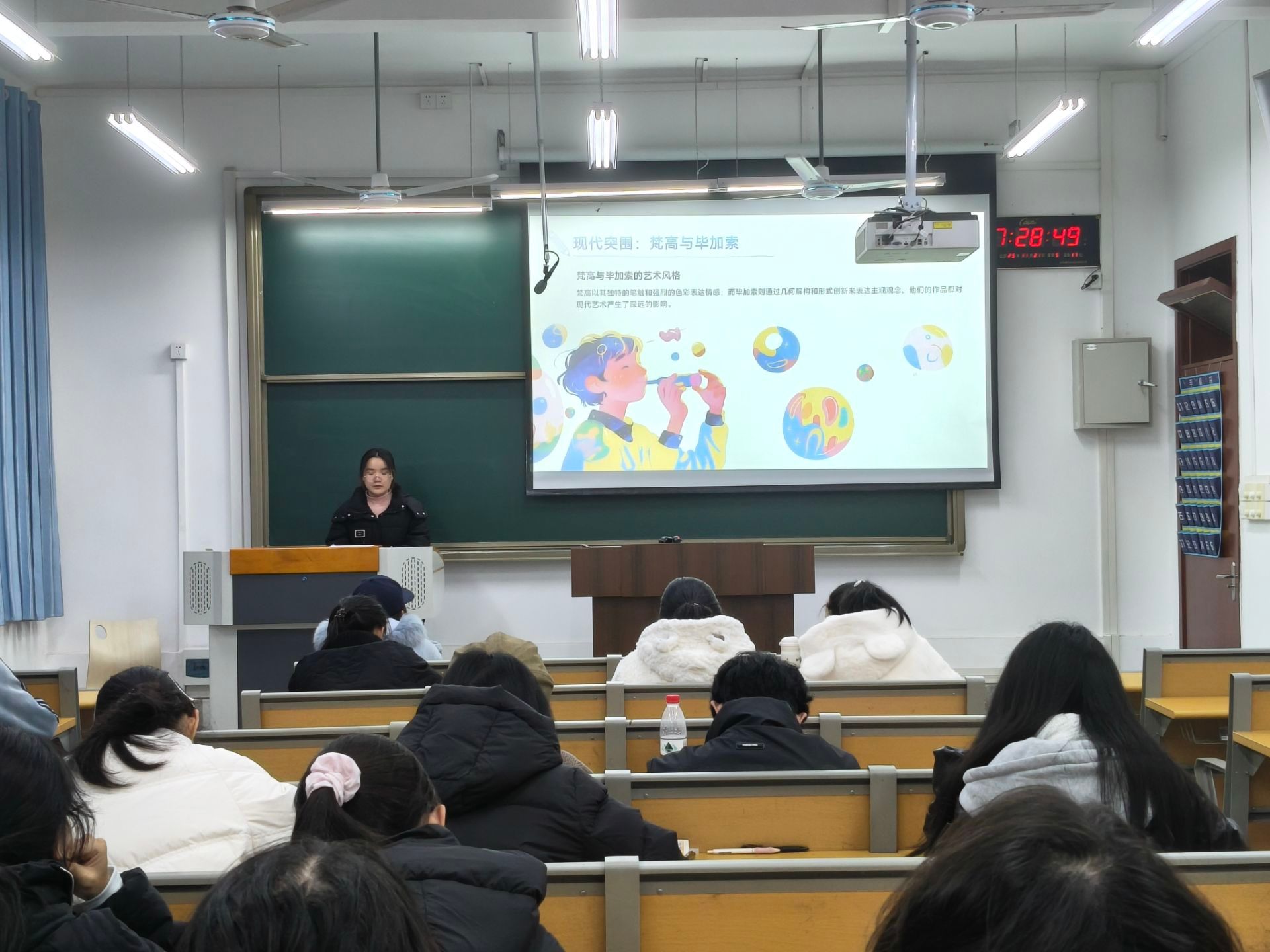 活动开始,主持人结合PPT演示与经典画作短片,系统讲解绘画构图技巧与色彩搭配原理,通过实例详细介绍水墨、水彩、素描等多元艺术风格的鲜明特质。创作环节中,同学们凝神聚力、潜心创作,将对山河风光的热爱、校园生活的感受与民族文化的体悟融入笔端,题材作品丰富,尽显创作才华。活动尾声,同学们踊跃分享创作灵感、交流技法心得,在互助共进中提升审美情趣与艺术修养,现场洋溢着浓厚的艺术学习氛围。