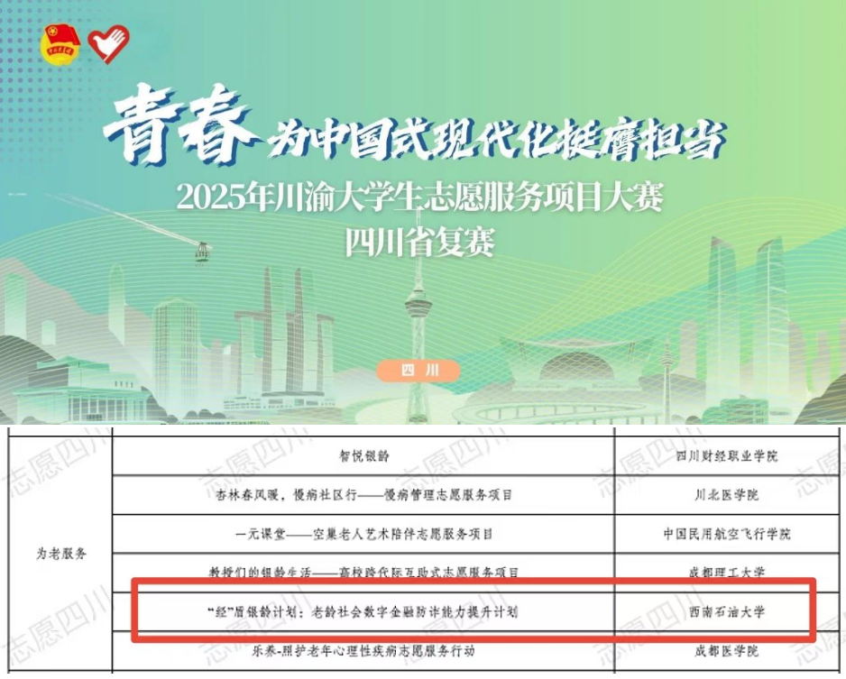 6月3日,2025年川渝大学生志愿服务项目大赛四川省复赛结果公示结束,我院“‘经’盾银龄计划——老龄社会数字金融防诈能力提升计划“项目获铜奖。