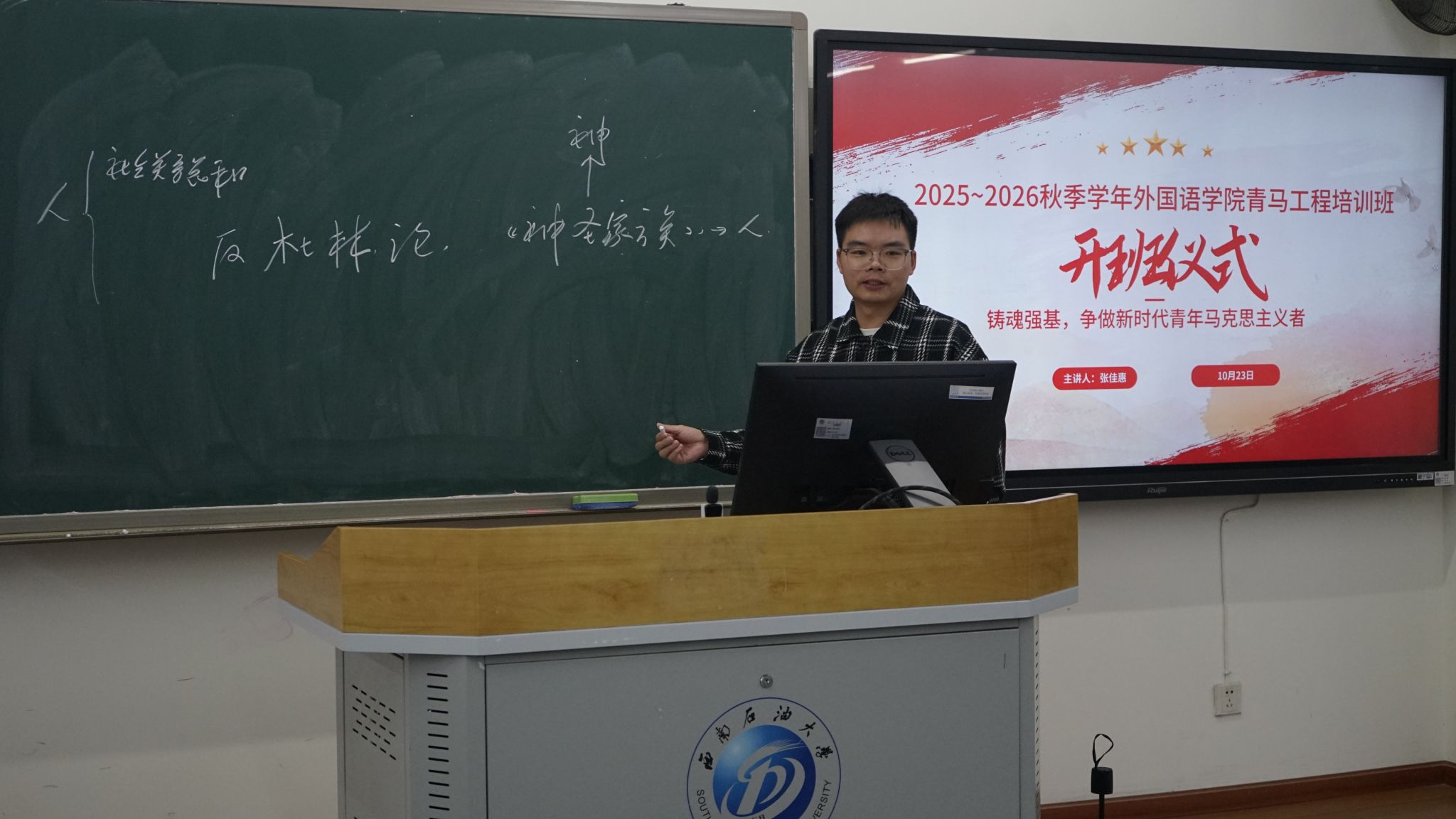 为深入推进青年马克思主义者培养工作,引导广大青年学子坚定理想信念、勇担时代使命,10月23日,外国语学院2025-2026秋季学年“青年马克思主义者培养工程”培训班正式开班。本次开班仪式以“铸魂强基,争做新时代青年马克思主义者”为主题,学院团委书记、学工办主任罗文双老师作马克思主义理论开篇讲解,随后由负责人张佳惠围绕青马工程核心内容展开专题授课以及往届优秀学员分享成长经验,外语院全体青马学员共同参与。
